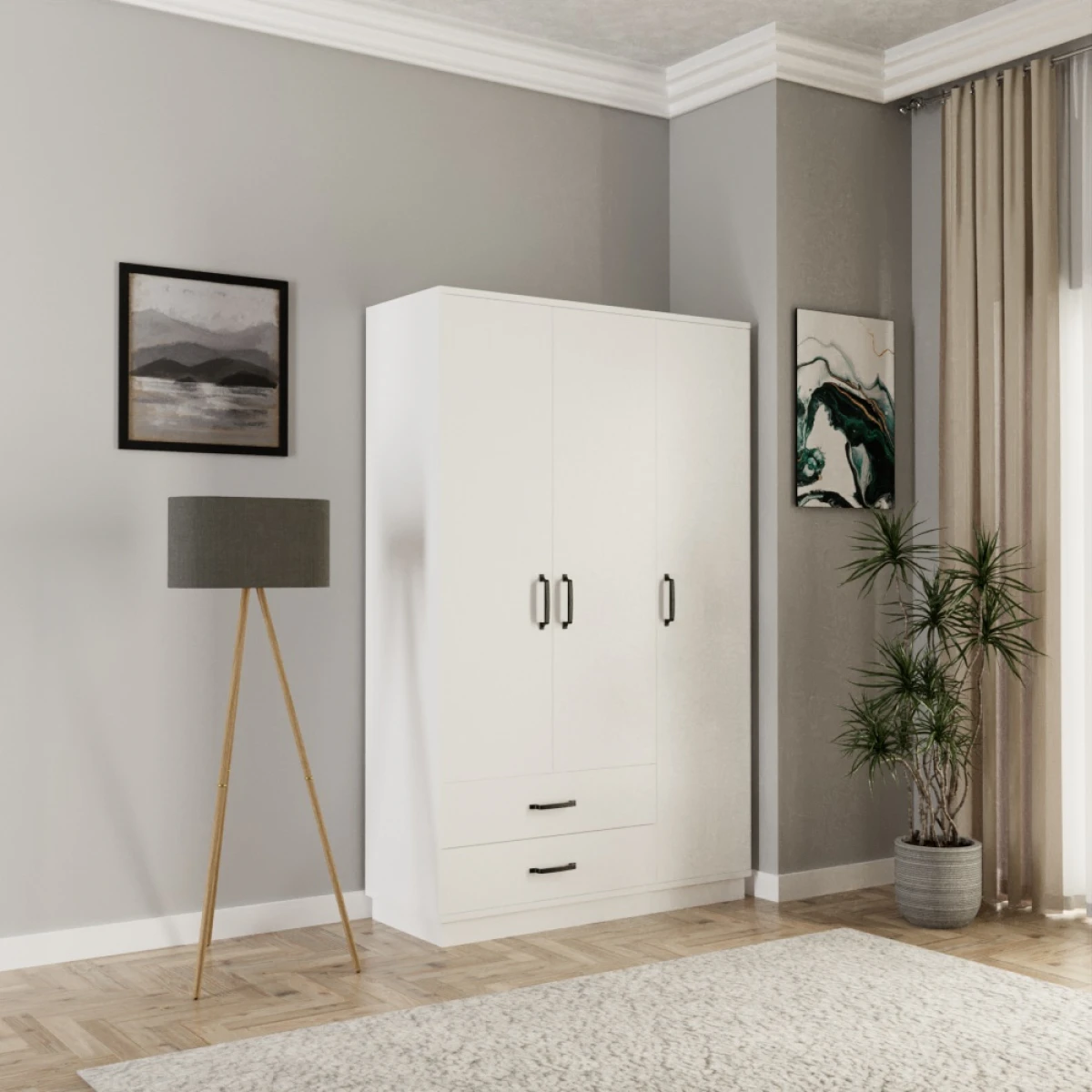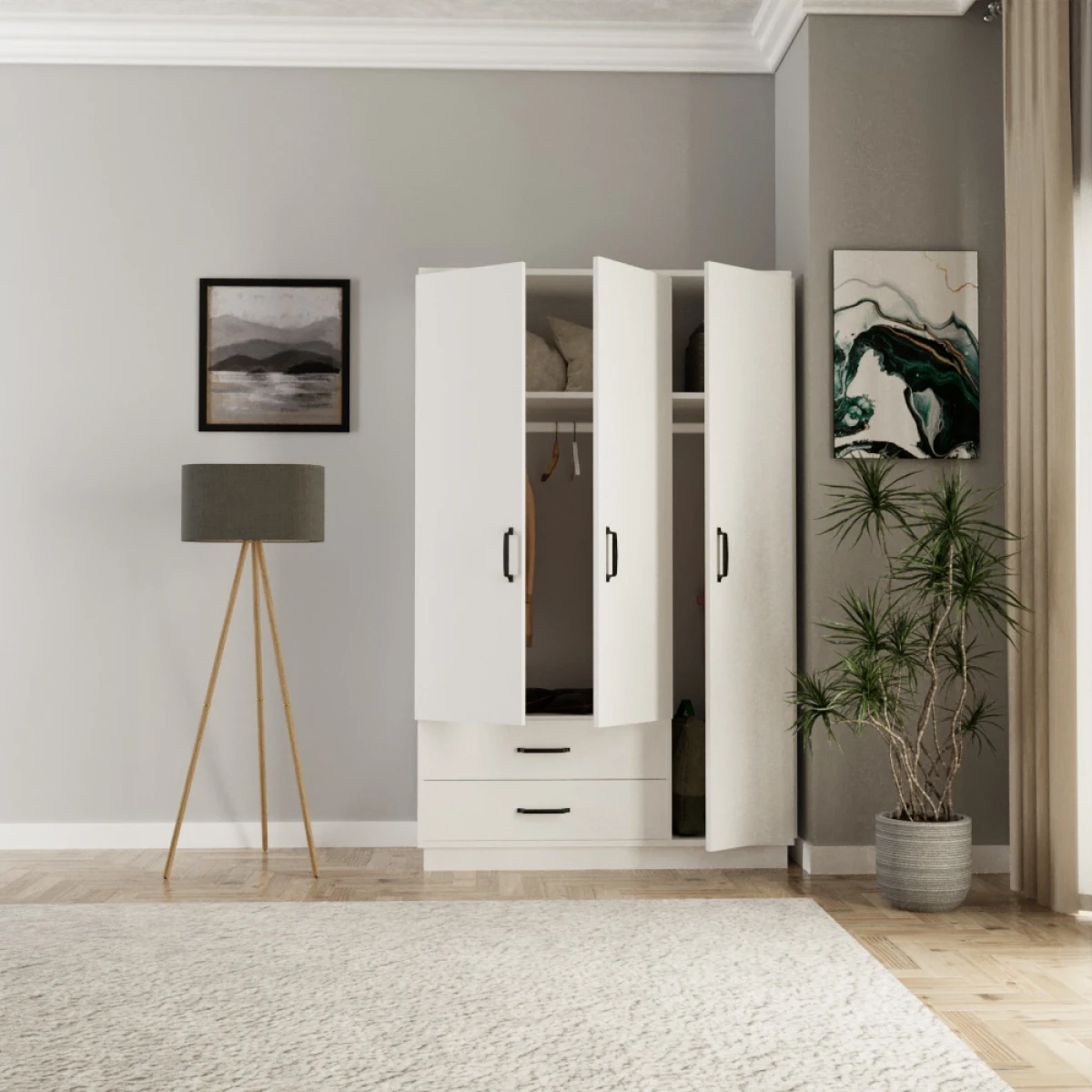 Ерна Гардероб, со својата едноставна бела боја и функционална структура, на вашите спални соби им дава свеж изглед. Благодарение на дизајнот со 3 врати и 2 фиоки, овозможува уредно складирање на вашата облека и предмети. Со компактните димензии, нуди идеално решение за тесни простори.