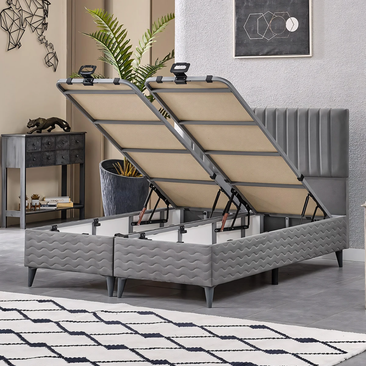 Комплетот за двоен кревет со легло и наслон Ezgi, со својот модерен сив изглед и цврста конструкција, ќе внесе елегантен и современ изглед во вашите спални соби. Благодарение на издржливата метална рамка на леглото и удобниот наслон, нуди долготрајна и практична зона за спиење.