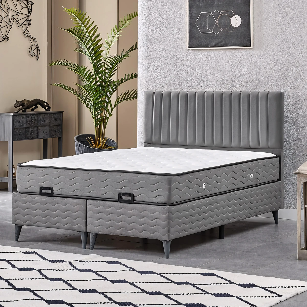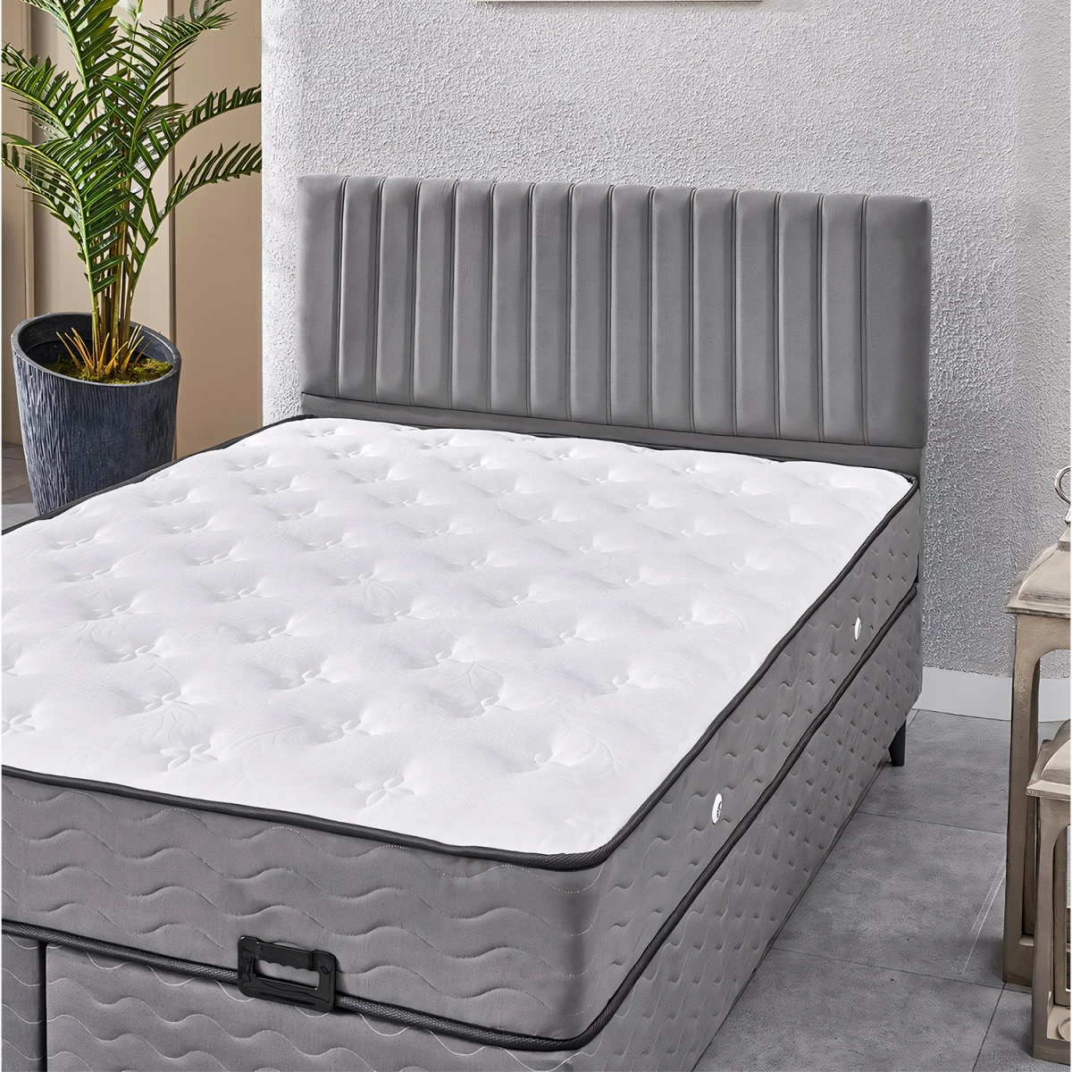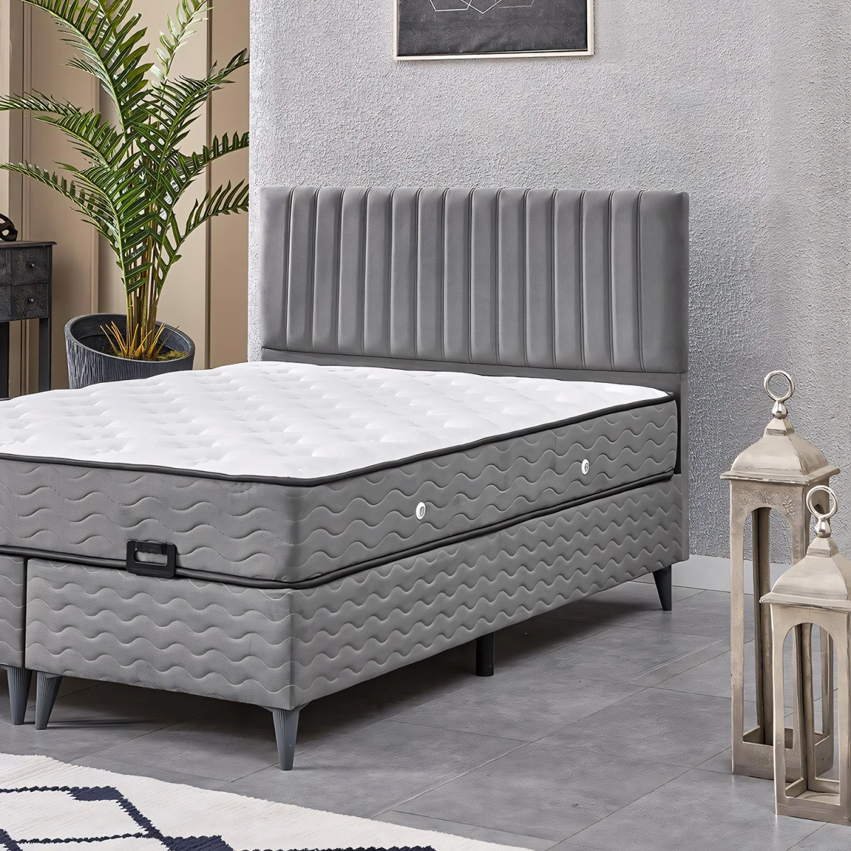 Ezgi Двосед легло, Наслов и Сет за Душек; со модерна сива боја, цврста структура и удобен дизајн, на вашите спални соби им додава елеганција и удобност. Благодарение на издржливата метална рамка на леглото, ергономскиот наслов и квалитетната структура на душекот, нуди долготрајно и пријатно искуство на спиење.