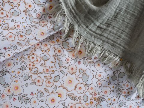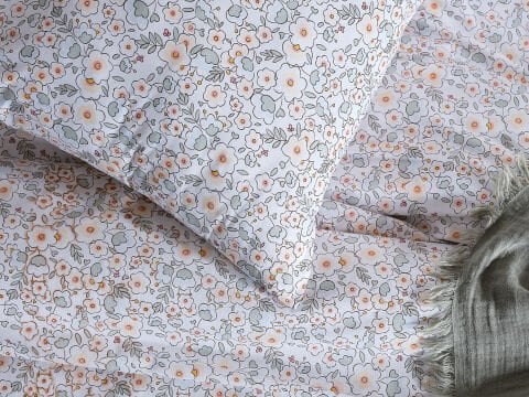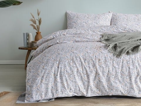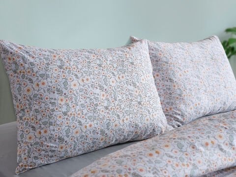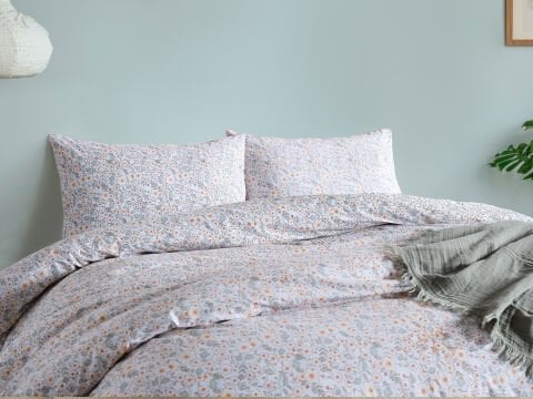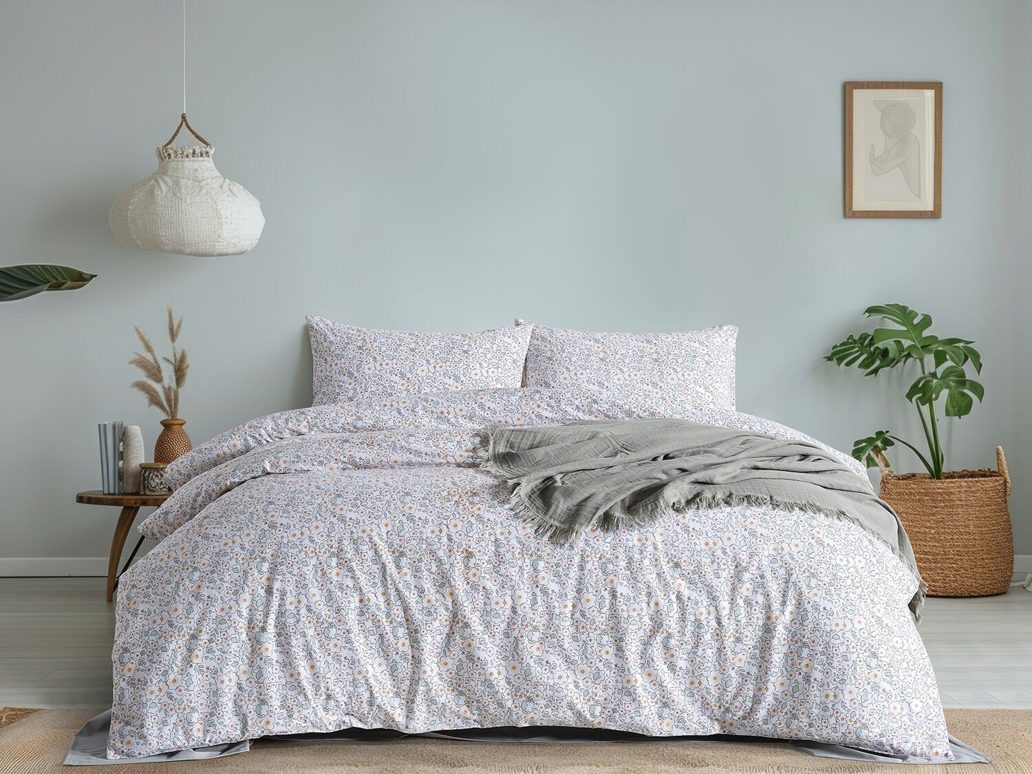 Комплетот за постелнина Фестивал Флум за двоен кревет, со цветни дезени на бела основа, нуди свеж и елегантен изглед. Со својата мека текстура, обезбедува удобно искуство за спиење.
