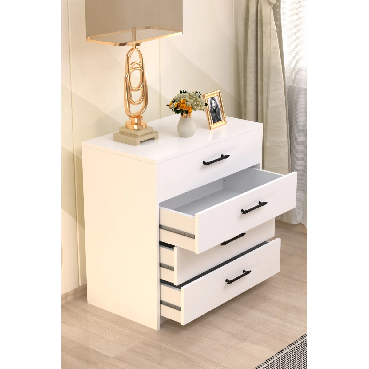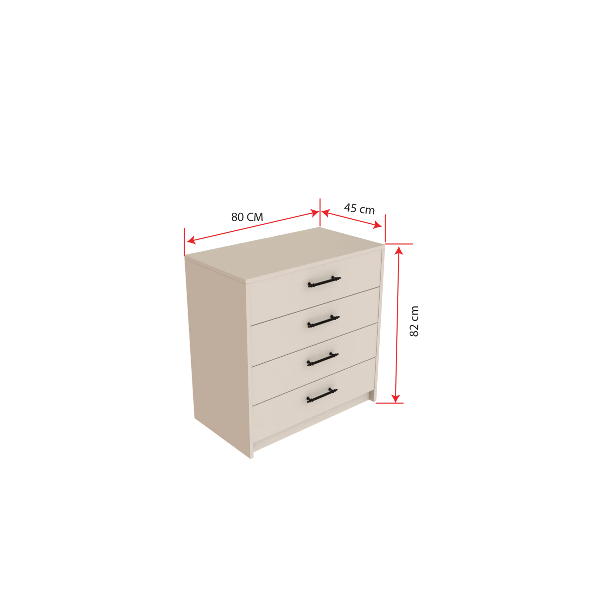 Фиона Комода, со својата едноставна бела боја и модерен дизајн, ќе донесе свеж изглед во вашиот животен простор. Благодарение на структурата со 4 фиоки, ви помага да ги чувате вашите предмети на организиран начин. Нуди долготрајна употреба со својата издржлива материјална структура и квалитетна опрема.
