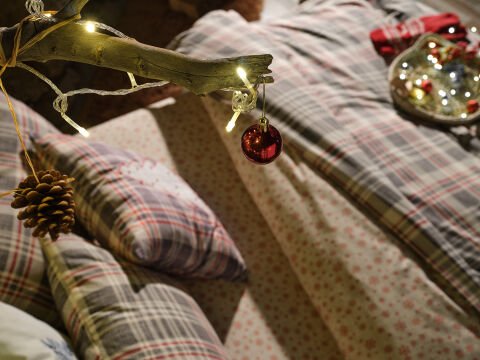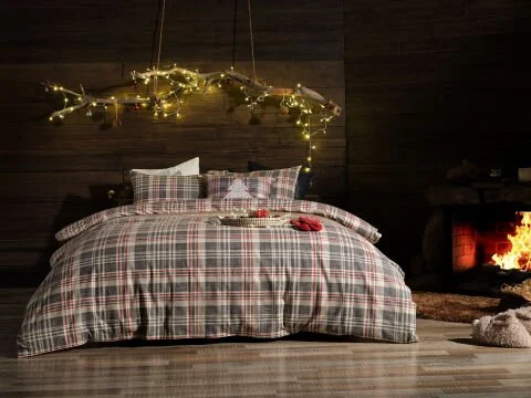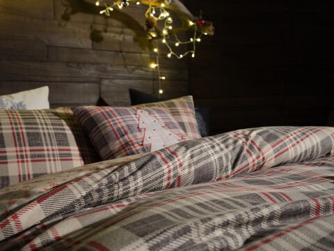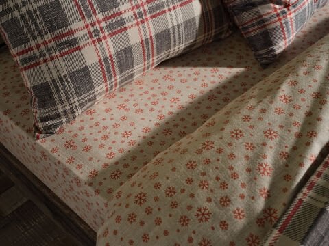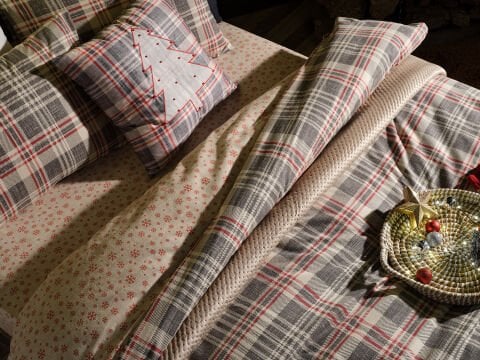 Комплет постелнина за двоен кревет изработен од мек фланелен материјал, во беж боја и со квадратен дезен. Обезбедува топол и удобен сон.