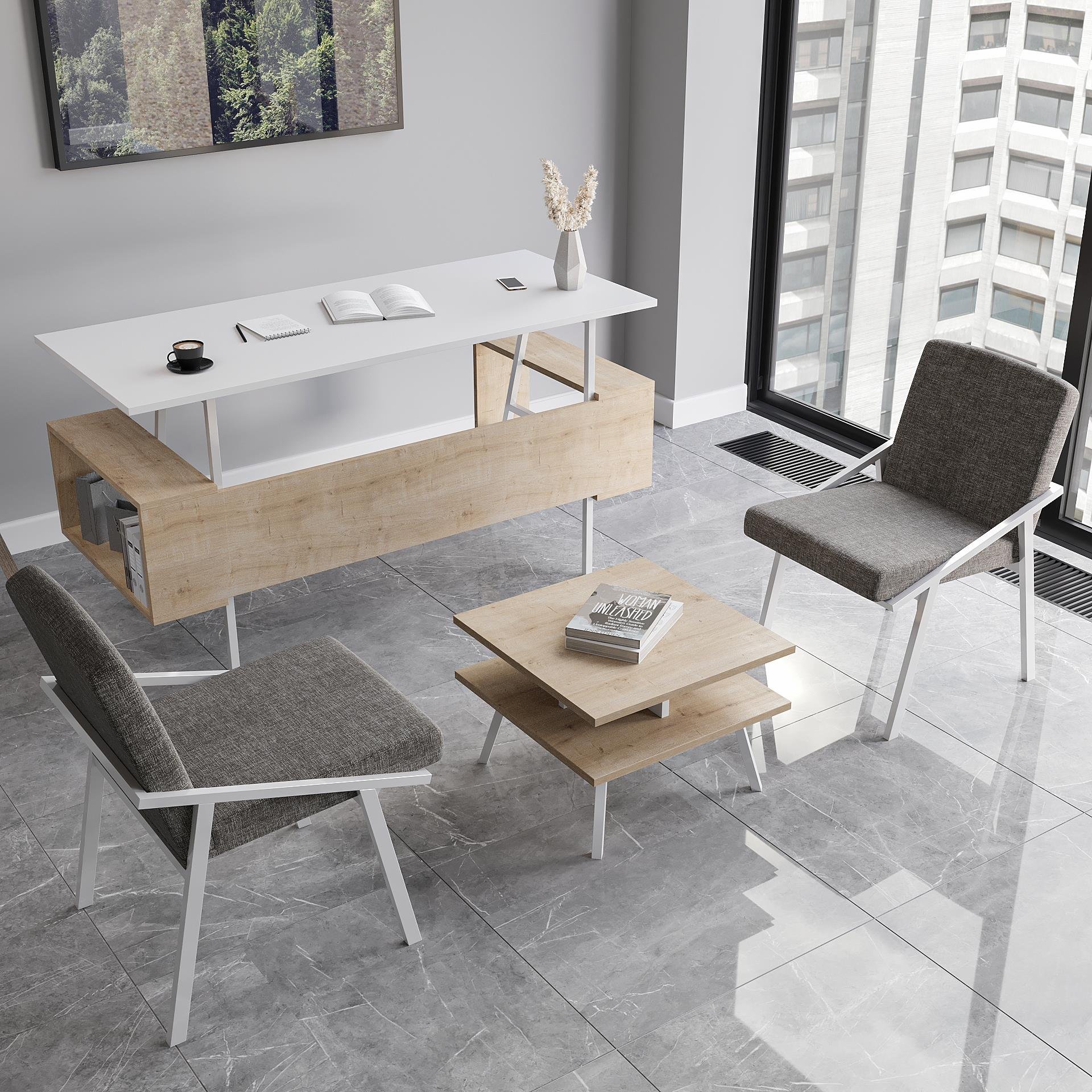 Опис на производот: ИРОНИЈА Двосед Офис Сет, со својот модерен и елегантен дизајн, додава удобност и естетика на вашите работни простори. 140 см маса со метални нозе, ергономски офис фотелји и функционален ормар ги комбинираат функционалноста, удобноста и елеганцијата. Овој сет, изработен од висококвалитетни материјали, обезбедува долготрајна и издржлива употреба. Со својата боја и дизајн што се вклопуваат во офис декорацијата, нуди продуктивна работна средина.
