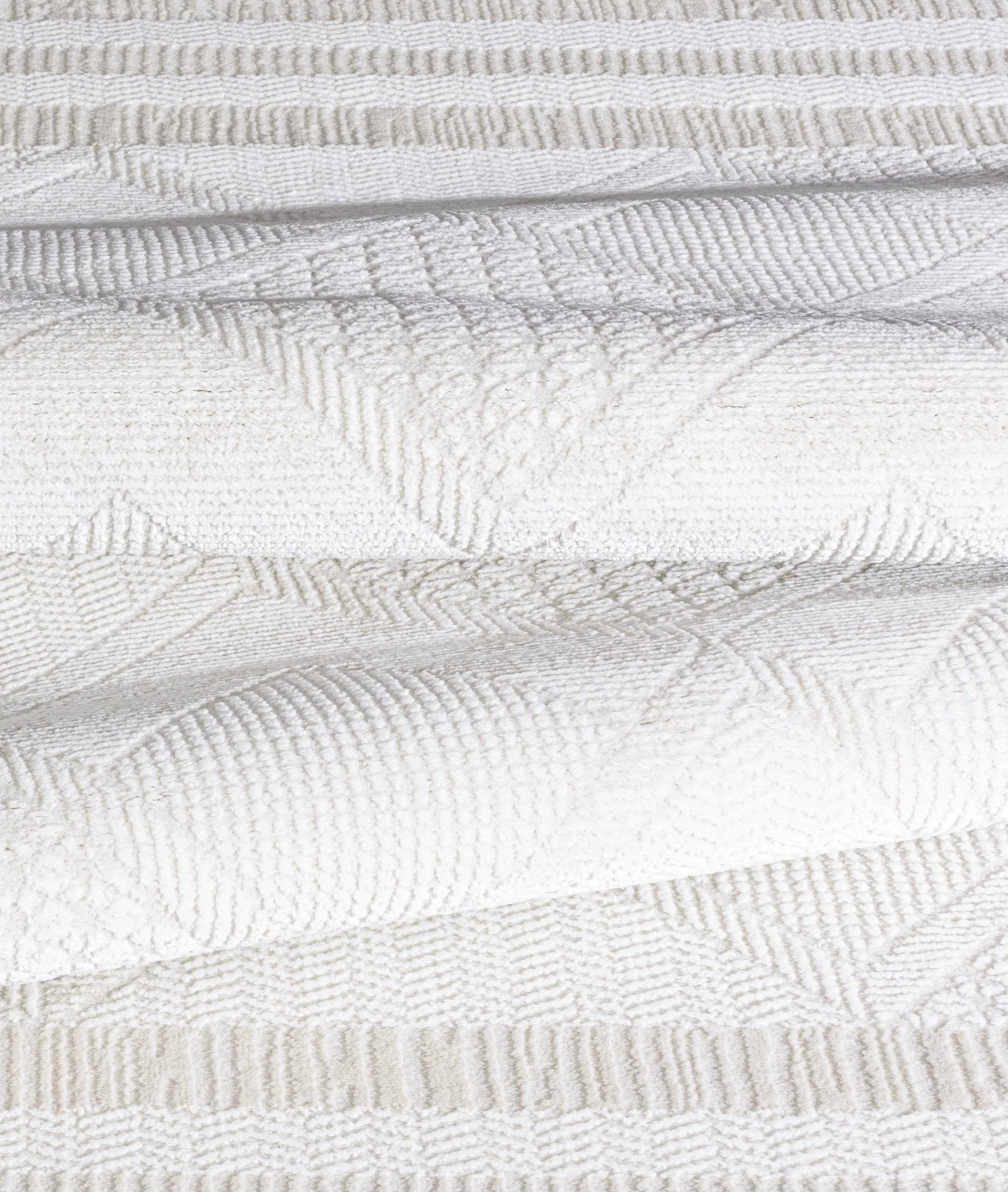 Крем тепихот кој се истакнува со елегантен и едноставен дизајн, комбинира модерни и класични линии за да додаде топол допир во животните простории. Овој тепих е изработен од олефински конец и нуди мека површина со висина на влакното од 10 мм, обезбедувајќи долготрајна употреба.