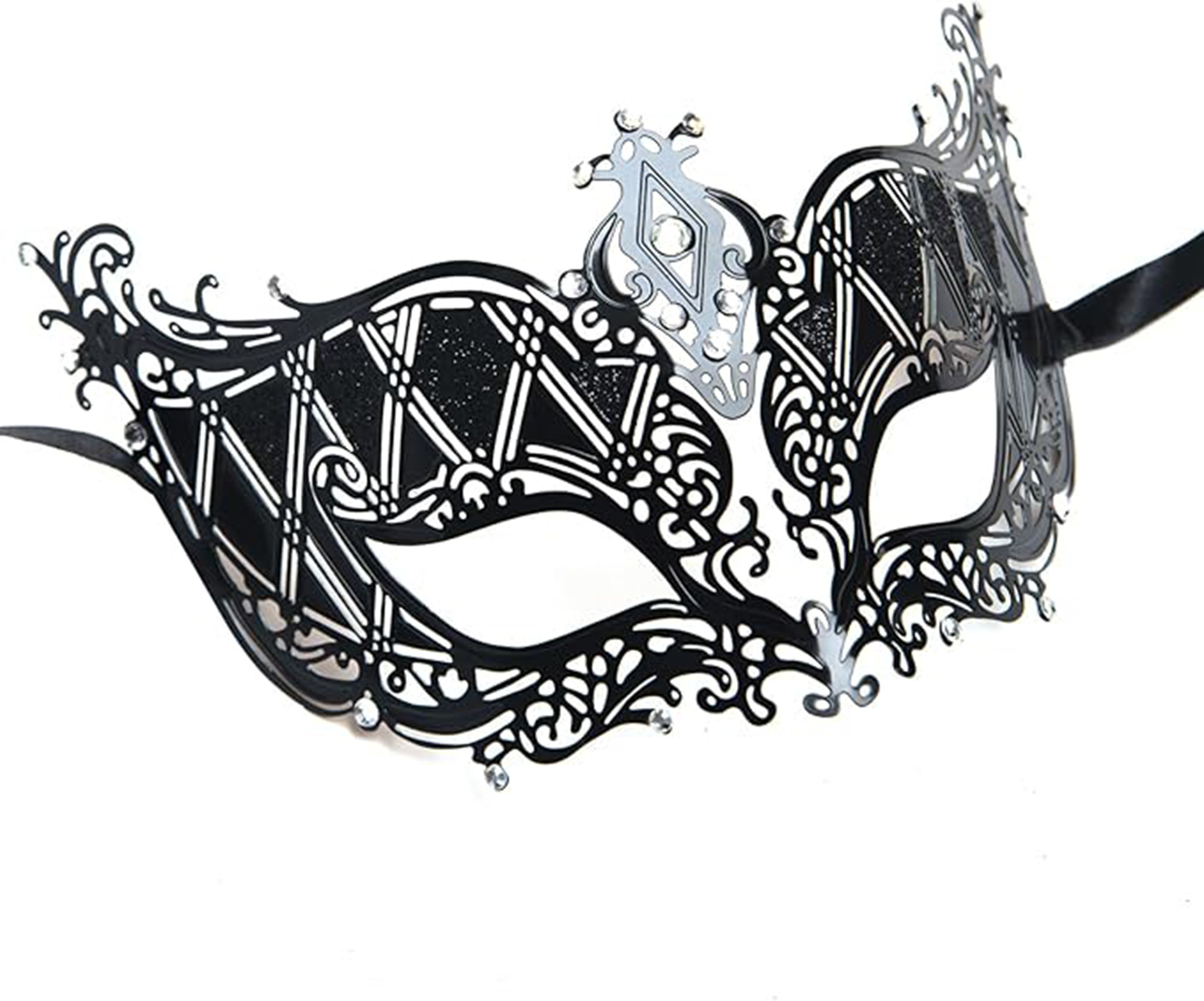 Кристална Сребрена Маска со Црн Лазерски Дизајн е луксузен додаток за вашиот следен настан. Изработена од висококвалитетен метал со лазерски рез, оваа маска е украсена со кристални камења, што и дава елегантен изглед.