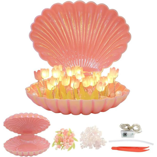 LED светилка со дизајн на морска школка е естетски привлечно решение за вашата декорација. Оваа светилка, со вградени лали и декоративни камчиња, создава романтична атмосфера во вашиот дом. Пакетот вклучува LED светло, вештачки лали, декоративни камчиња и монтажни делови, што ја прави идеална за DIY проекти.