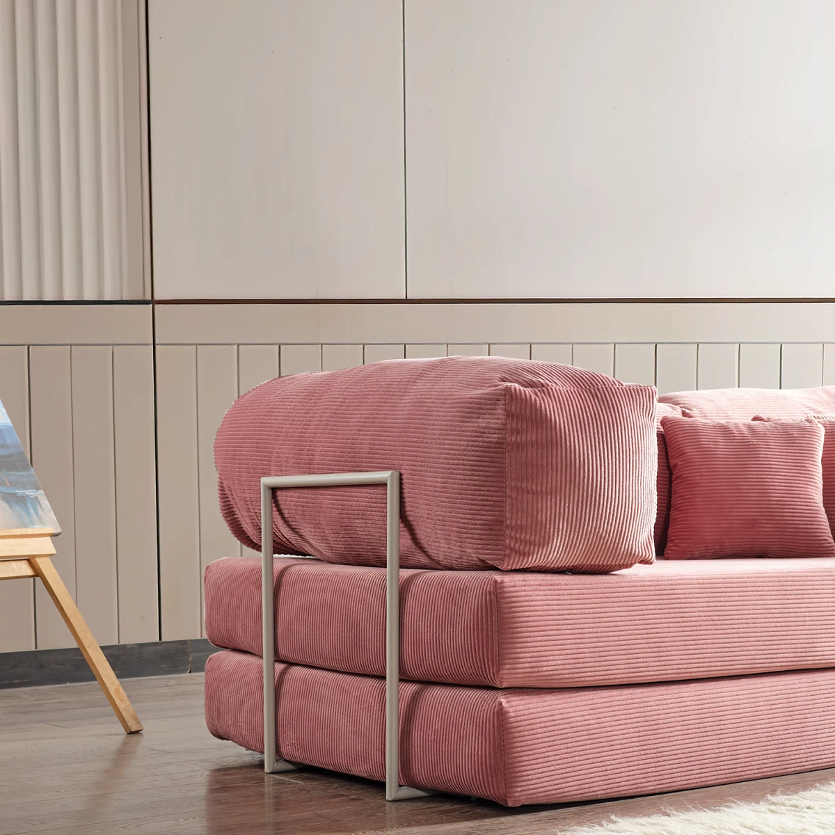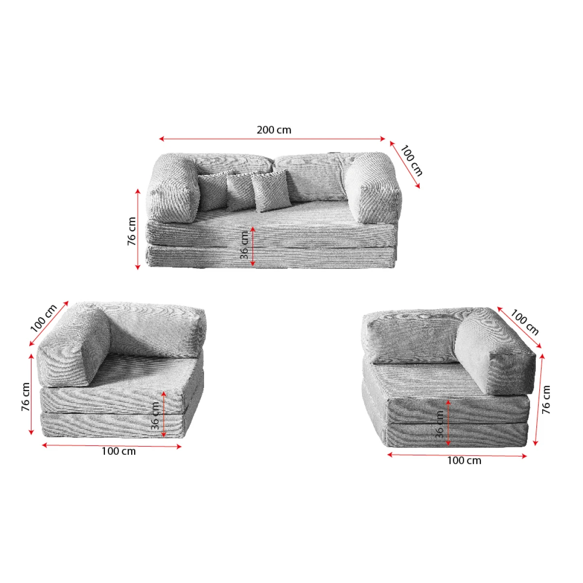 Ткаенината од памук со кашкорсе ребра; обезбедува долготрајна удобност со својата мека текстура, елегантен изглед со линии и издржлива структура. Благодарение на структурата на телото од сунѓер и првокласниот 28 DNS мек сунѓер, ја задржува својата форма без да пропаѓа и нуди максимална поддршка. Дизајнот без нозе создава модерен и минималистички стил, додека ви заштедува простор.