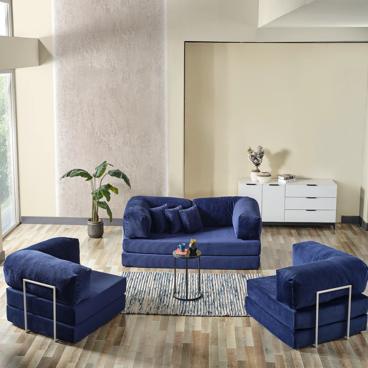 Legom Avanos мултифункционалниот сет за седење, со својата функционална структура која може да се претвори во кревет и модерен дизајн, нуди комфор и естетика во вашиот животен простор. Благодарение на неговата сина боја, создава свежа, мирна и елегантна атмосфера. Обезбедува удобно седење за секојдневна употреба, а по потреба може да се користи и како практичен кревет.