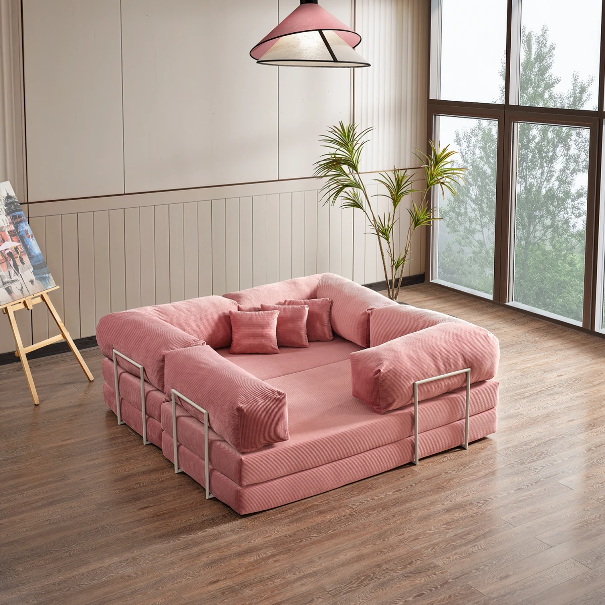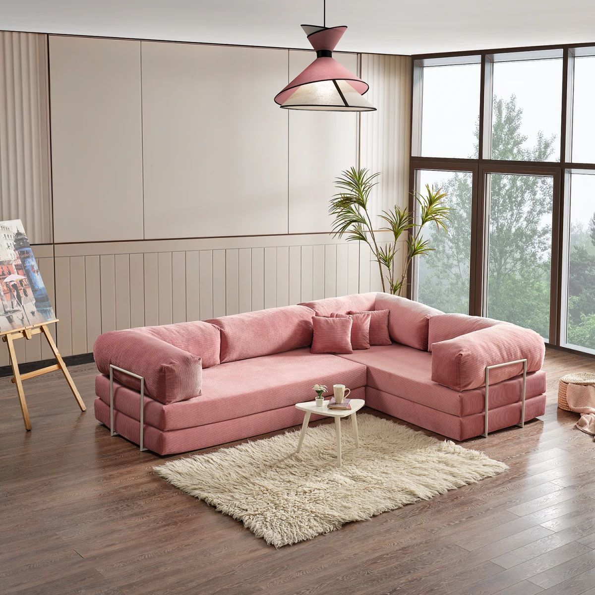 Legom Lucas Мултифункционален L Кауч, со својата функционална структура која може да се претвори во кревет и модерен дизајн, носи удобност, естетика и леснотија на користење во вашиот простор за живеење. Благодарение на бојата пудра, додава елегантна, свежа и топла атмосфера во просторот. Нуди удобност за секојдневно седење, а по потреба може да се користи и како практичен кревет.