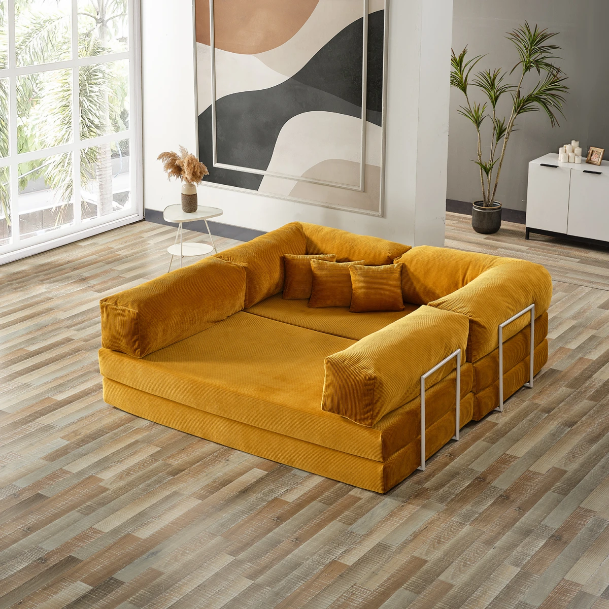 Legom Petek Мултифункционален L Кауч, со својата функционална структура која може да се претвори во кревет и со својата сенф боја, додава енергија и топлина во вашиот животен простор. Благодарение на неговите модерни линии и мултифункционалната употреба, нуди практично решение и за секојдневни седенки и за примање гости. Додека го става комфорот во преден план со својата широка површина за седење, лесно се претвора во кревет кога е потребно, обезбедувајќи дополнителна удобност.