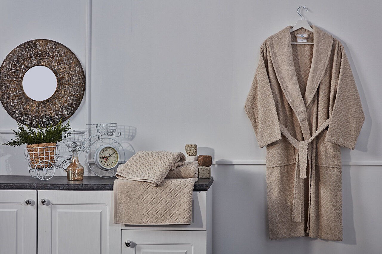 Луксузниот бањар визон изработен од 100% памучна ткаенина, обезбедува врвен комфор по бањање со својата свиленкаста мекост и висока апсорпција. Со својот елегантен дизајн, нуди стил и удобност заедно.