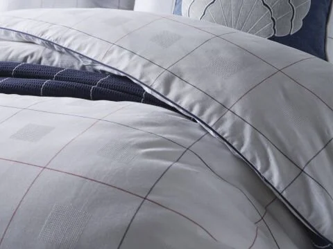 Постелни комплет за двоен кревет во бела боја, со квадратен дезен и мека текстура.