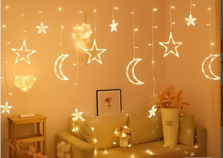 Содржи 12 парчиња месечини и ѕвезди, и доаѓа со приклучен кабел за лесно користење. Завесата нуди 8 различни функции за осветлување, што ја прави многу флексибилна за различни прилики.