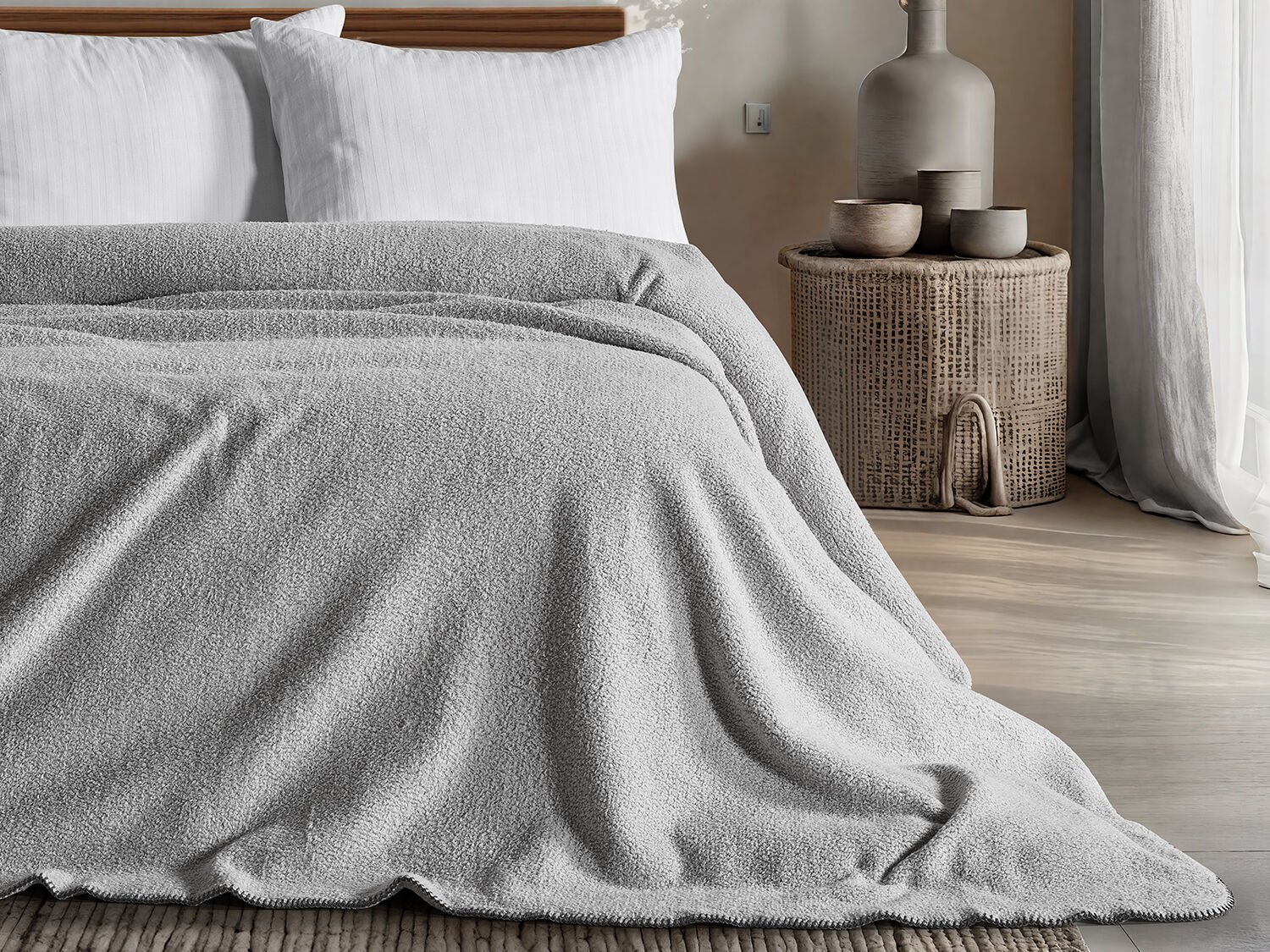 Светло сивото ќебе Мофи, кое се истакнува со својата мека текстура и едноставен дизајн, нуди топло и удобно користење со својата единечна големина. Благодарение на лесната структура, идеално е за сите четири сезони.