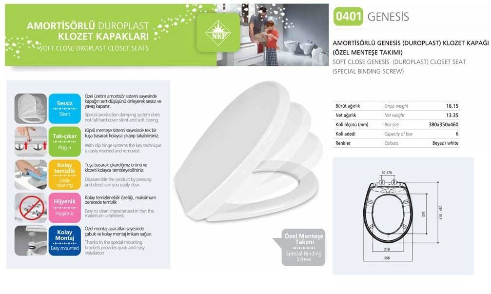 Подобрете го вашето искуство во бањата со иновативниот NKP Genesis Капак за Тоалетна Школка со Меко Затворање и Брзо Отстранување. Дизајниран за максимална удобност и хигиена, овој капак се одликува со механизам за меко затворање кој спречува бучава и оштетување. Функцијата за брзо отстранување овозможува лесно чистење и одржување, обезбедувајќи беспрекорна чистота во вашата бања. Изработен од висококвалитетни материјали, NKP Genesis капакот е издржлив и долготраен, совршен додаток за секоја модерна бања.
