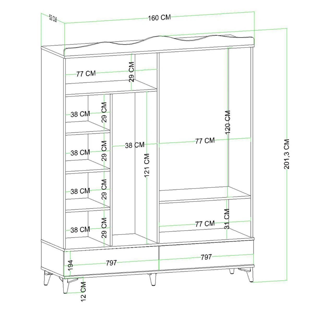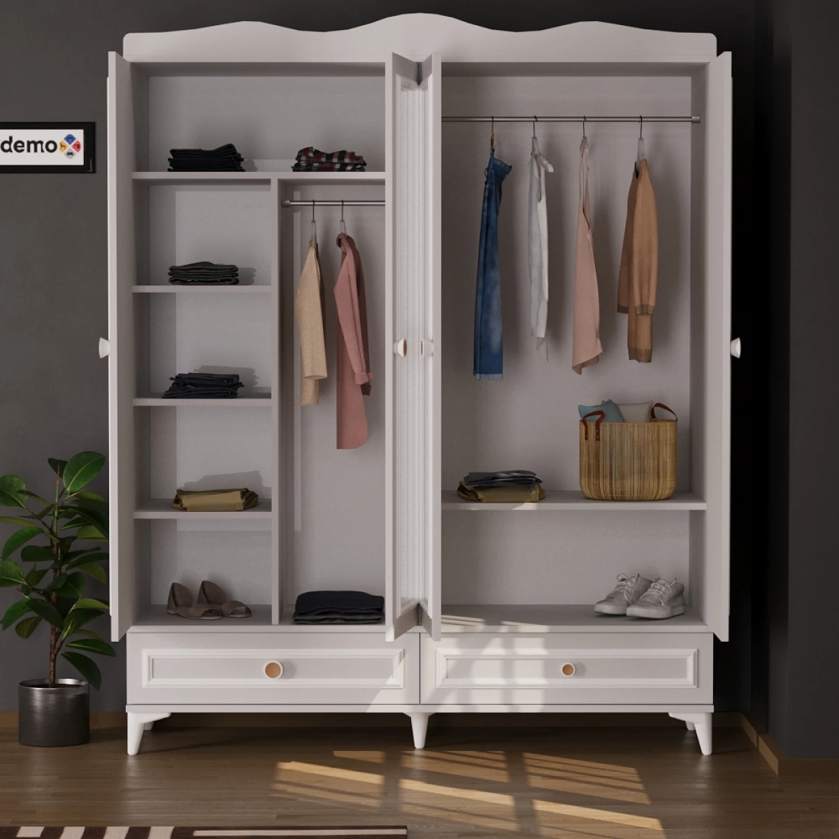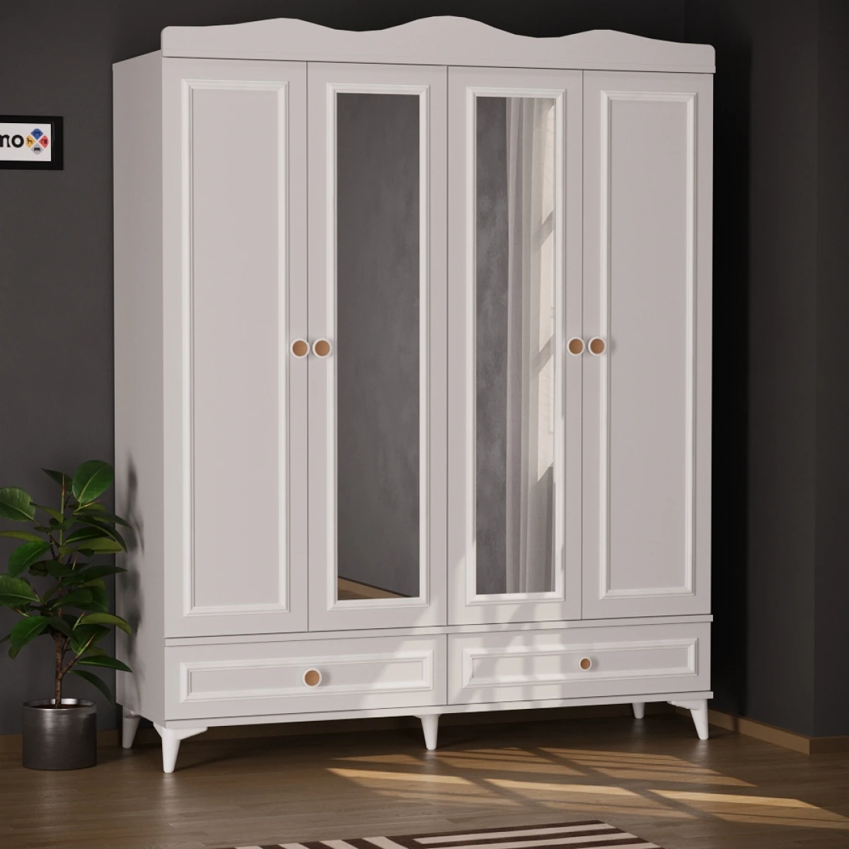 Нова Гардероба, со својата едноставна бела боја и огледален дизајн, ќе донесе свеж и модерен изглед во вашите спални соби. Со структура од 4 врати и 2 фиоки, ви помага да ги организирате вашите облеки и предмети на уреден начин. Нуди долготрајна употреба благодарение на издржливиот материјал.
