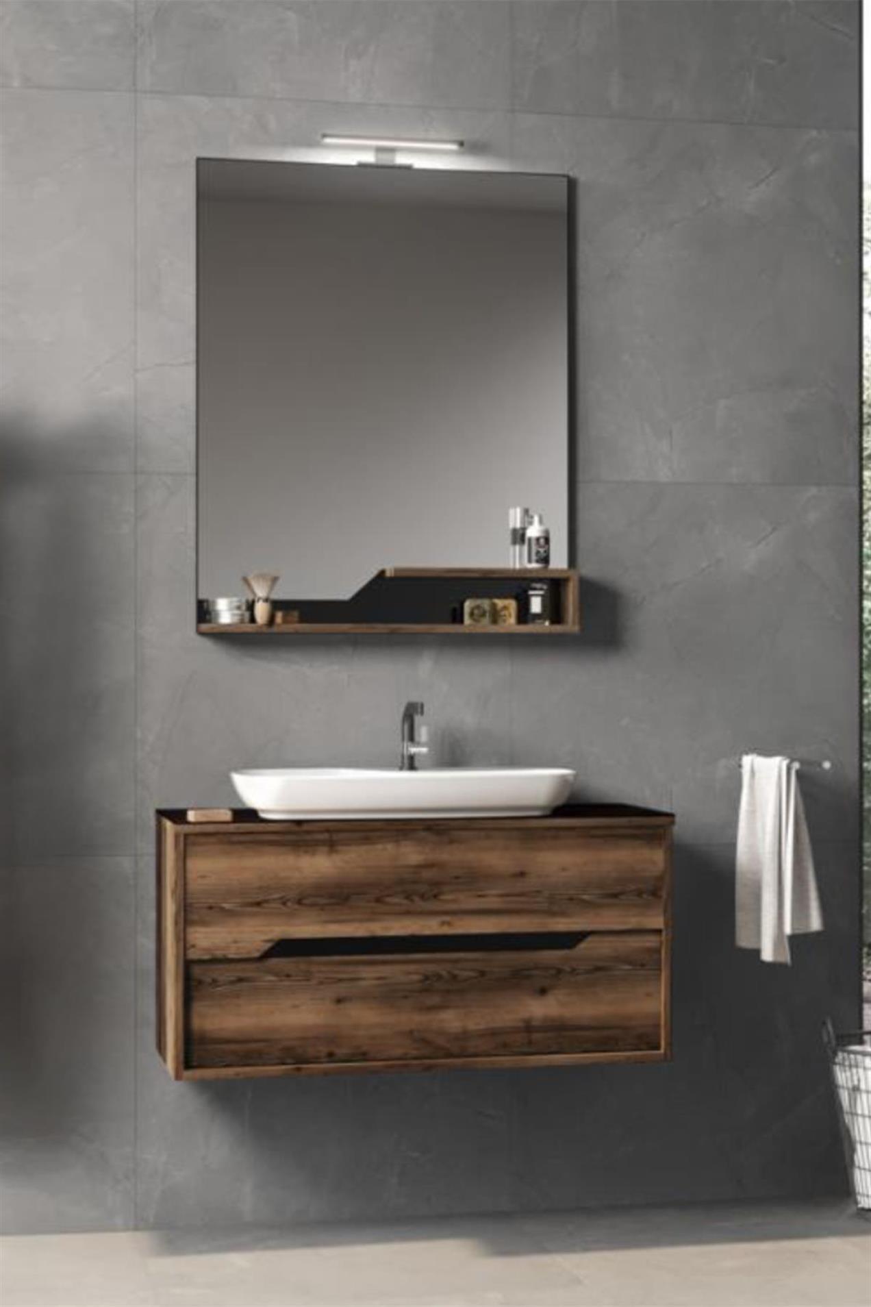 Орка Галиа 100 цм Ела Бања Сет за Долна Во Соба, со својот шик и функционален дизајн, е идеално решение за големи бањи. Телото е изработено од меламински чипс плочи со Ела боја и текстура. Со потполно отворање на чекмењата со коци и капаците со коци, обезбедува тивко и удобно користење. Со керамички умивалник на плоча и елегантен црн стаклен плот, додава модерен и луксузен допир на вашата бања.