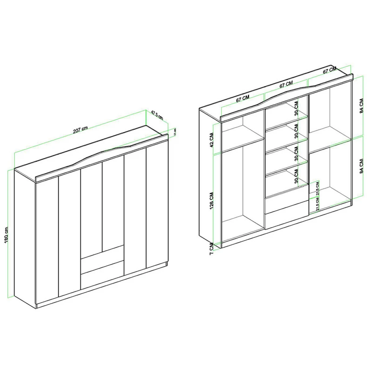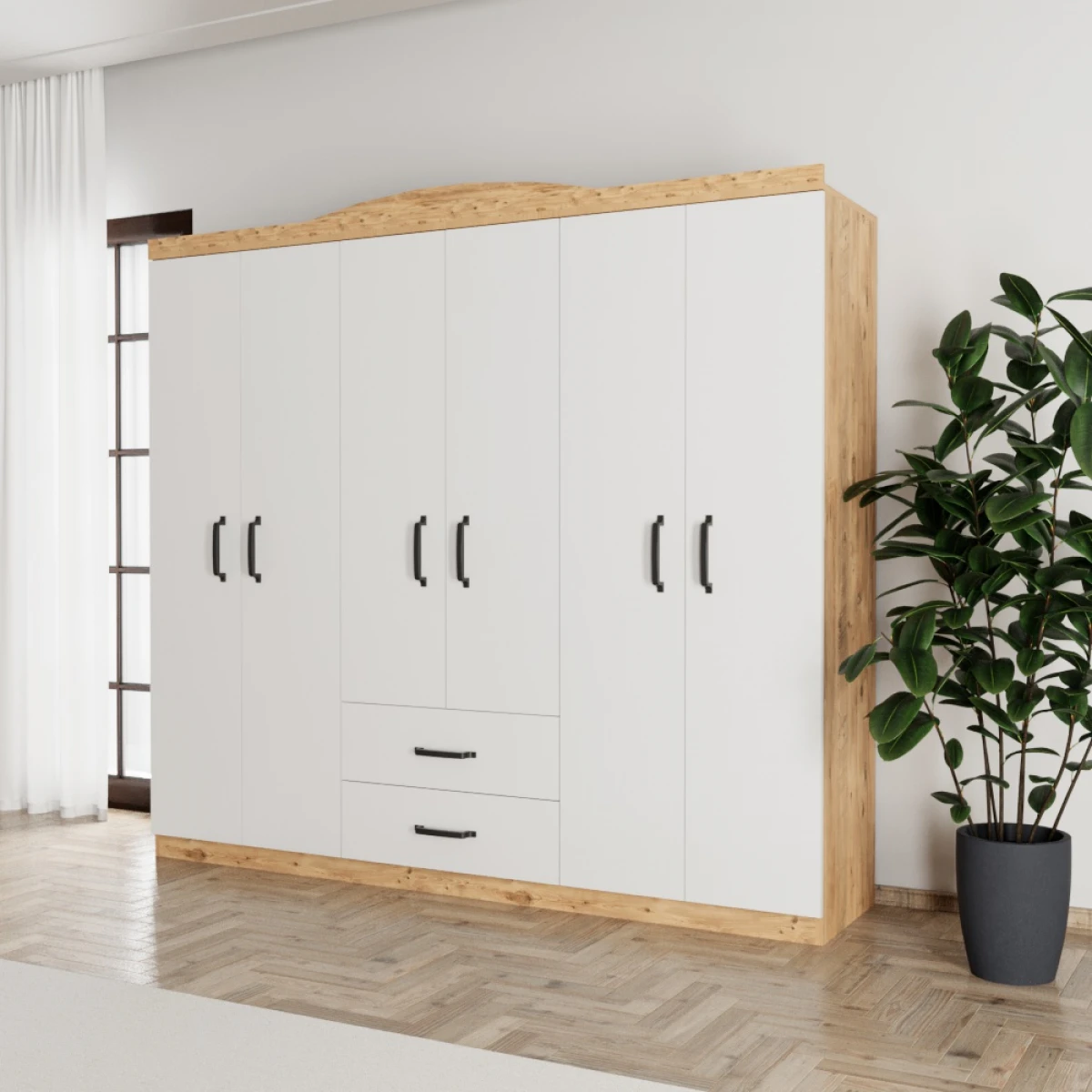 Орманот за облека Селин, со бела и борова боја, му дава свеж и модерен изглед на вашата спална соба. Со дизајн од 6 врати и 2 фиоки, тој нуди пространа област за складирање, помагајќи ви да ги чувате вашите предмети уредно. Изработен од издржливи материјали, обезбедува долготрајна употреба.