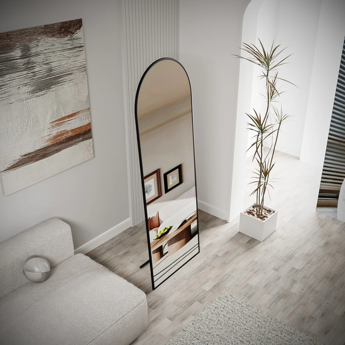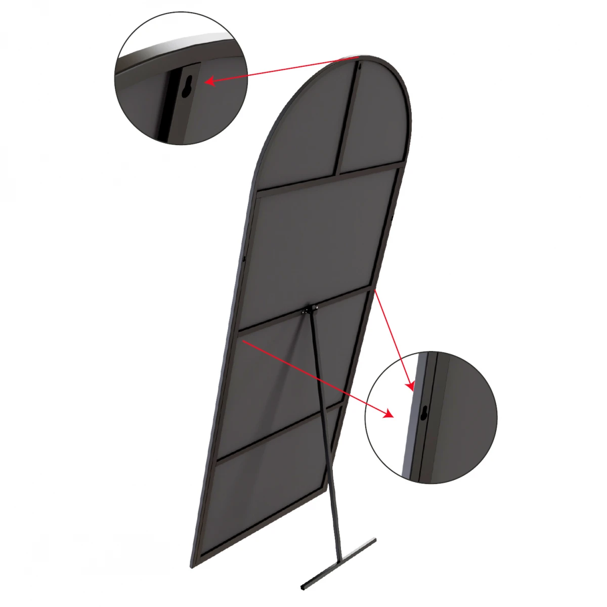 Огледалото Pamir со својата црна метална рамка и дизајн со ногарки додава модерен и елегантен допир во вашите животни простори. Со висина од 180 см и ширина од 60 см, огледалото нуди целосна употреба, а благодарение на издржливиот метален профил со електростатичко прашкасто бојадисување и полираните рабови, обезбедува долготрајна и безбедна употреба. Благодарение на системот со преклопни метални ногарки, може да се користи и со ногарки и монтирано на ѕид. Производот се испраќа подготвен за употреба.