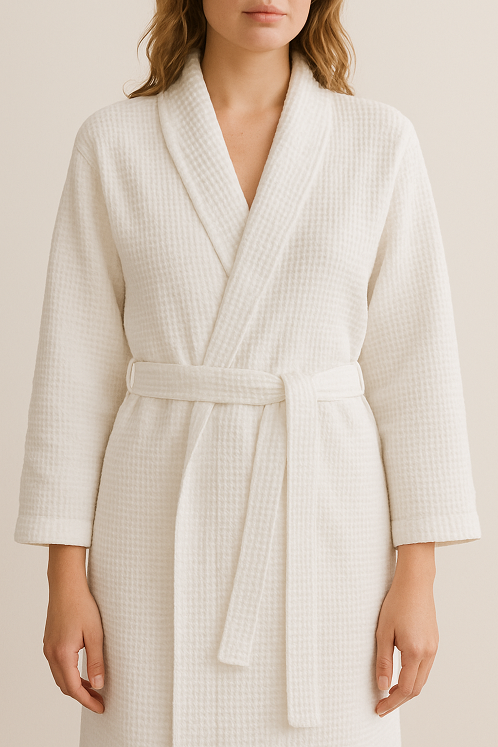 Белата бањарка со шал јака, која се истакнува по својата лесна и дишечка структура, нуди удобно и пријатно користење. Благодарение на 100% памучната ткаенина, не предизвикува потење, брзо се суши и е пријателска кон кожата. Идеален и елегантен модел на бањарка за спа, хотел и домашна употреба.
