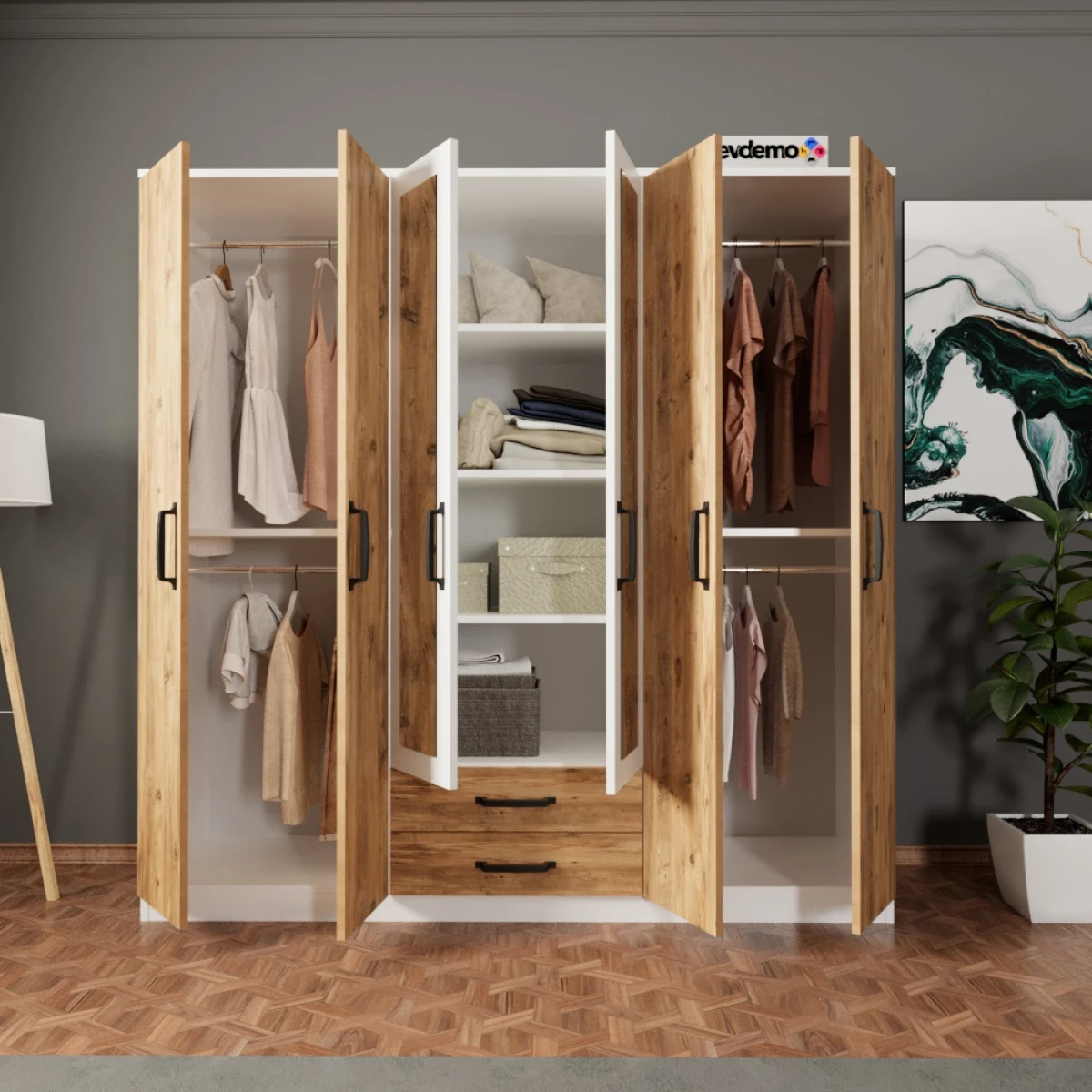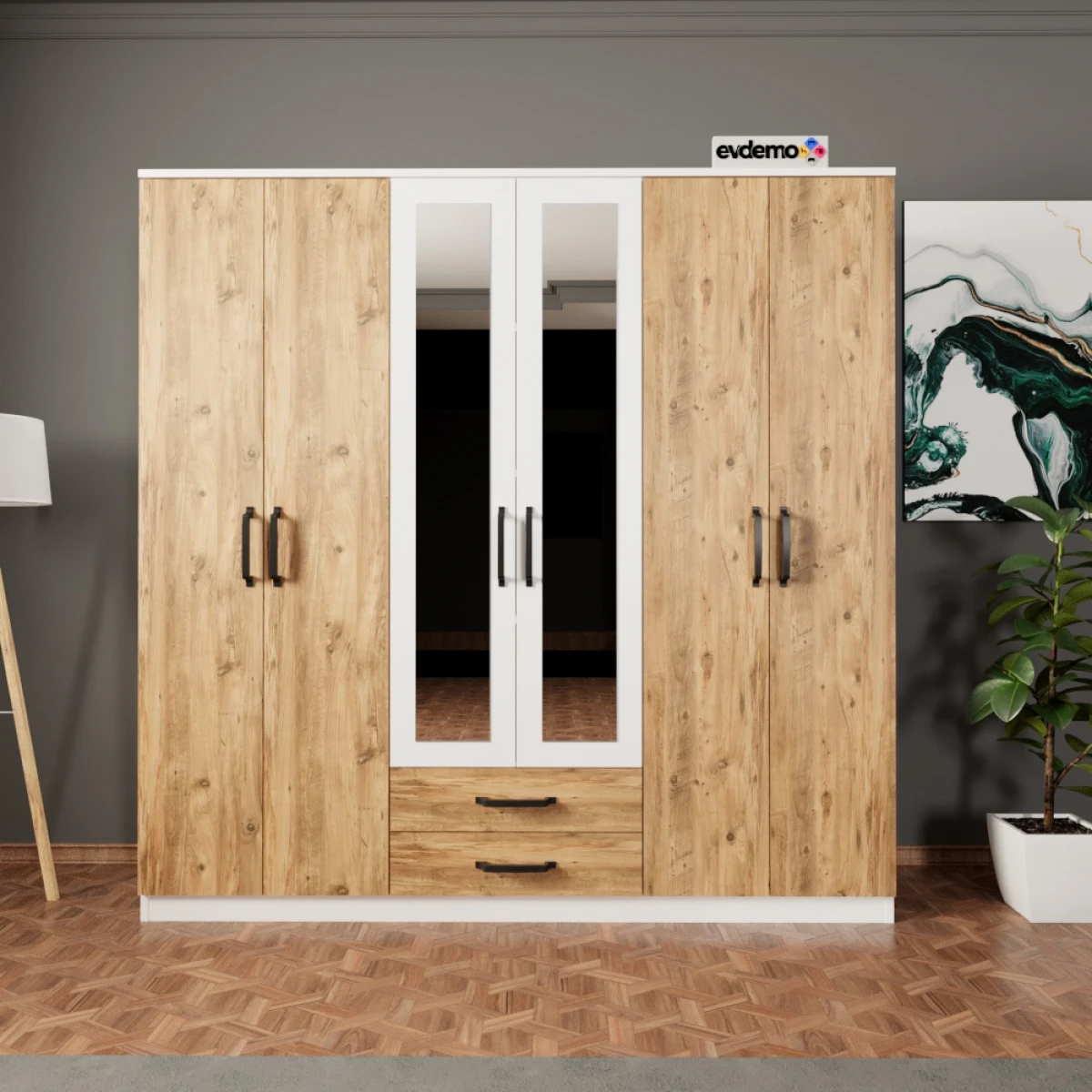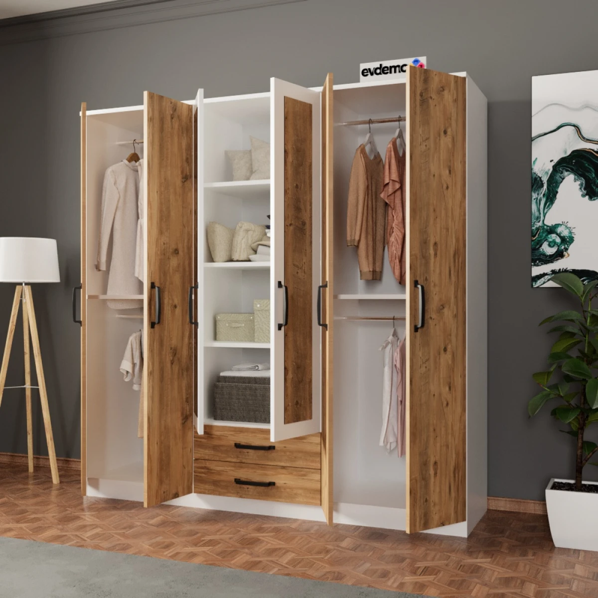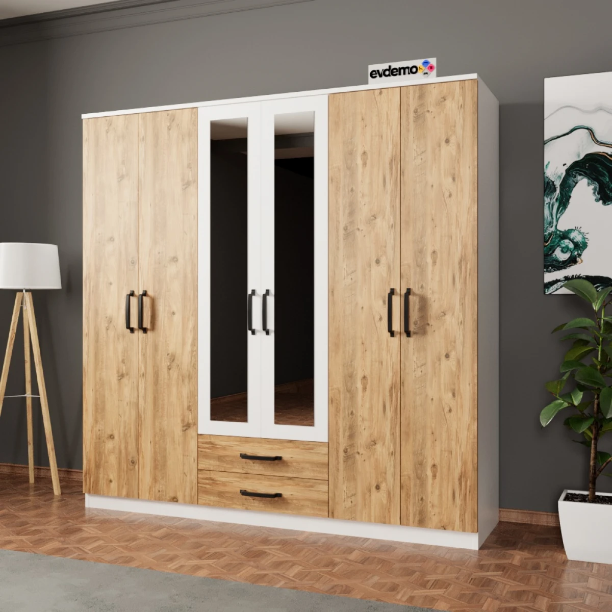 Праг Гардероб, со комбинацијата на бор и бела боја, ќе донесе модерен и свеж изглед во вашите спални соби. Со дизајнот со 6 врати, 2 фиоки и огледало, нуди широк простор за складирање и обезбедува удобност при секојдневна употреба. Изработен е од издржливи материјали за долготрајна употреба.