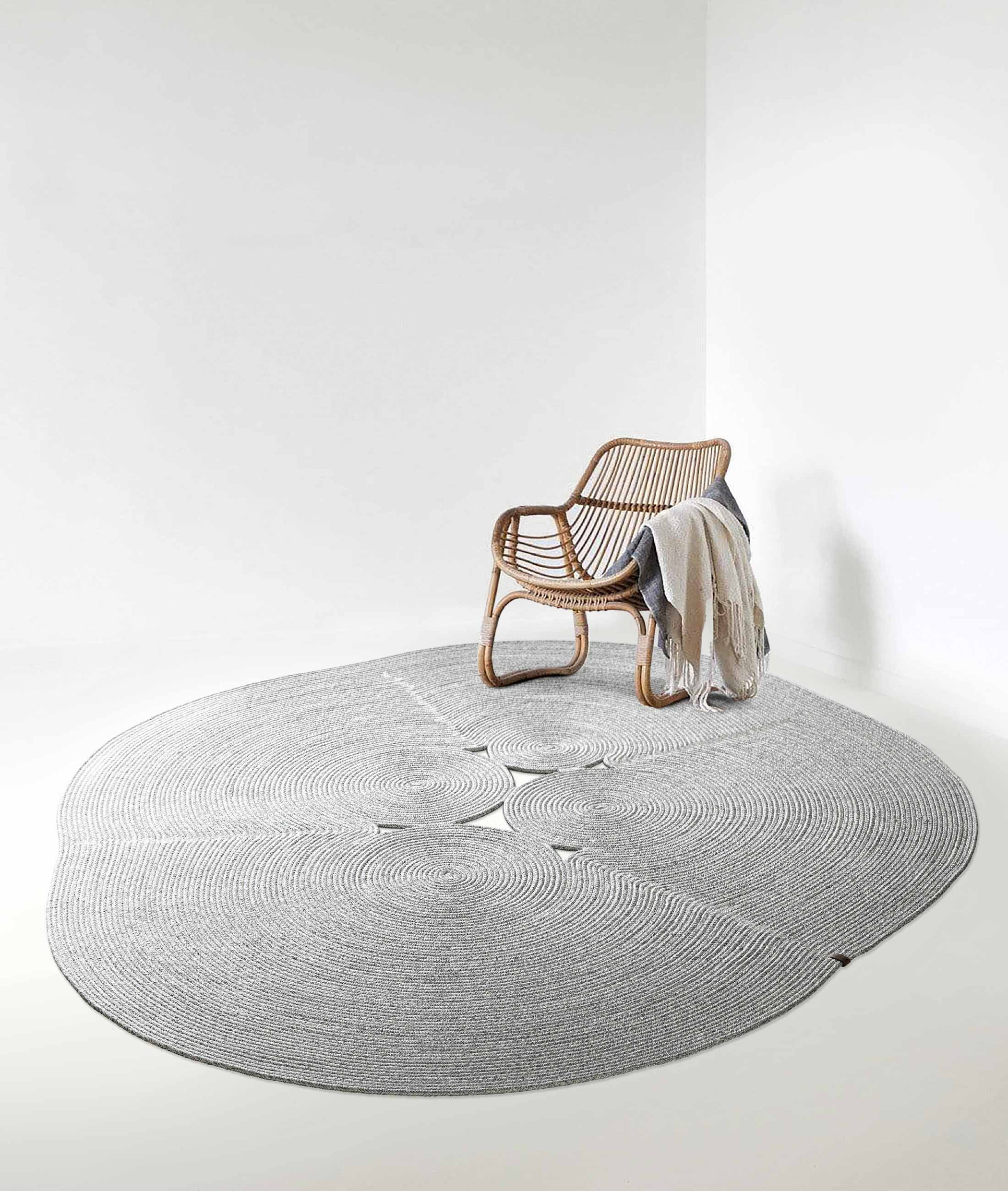Модерниот елипсовиден облик и рачната изработка на сивиот плетен тепих, со својата природна памучна текстура, додаваат елеганција на балконите и терасите. Благодарение на отпорноста на вода и сонце, нуди долготрајна употреба. Со својата перлива карактеристика, претставува и естетски и практичен декорациски елемент.