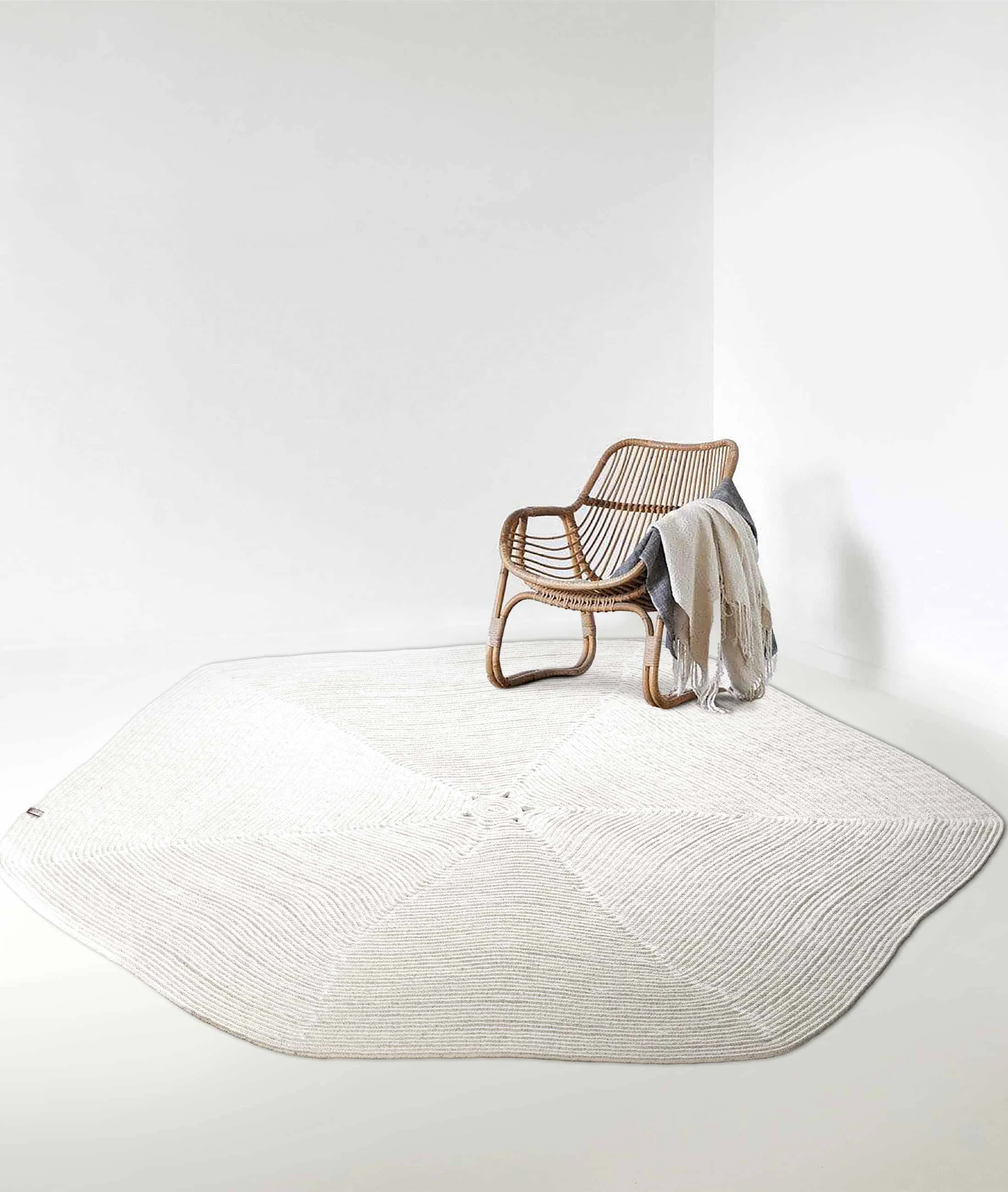 Шестаголниот бел сламен тепих, кој се истакнува со својот модерен дизајн и рачна изработка, е внимателно произведен од памучен конец. Благодарение на својата отпорност на вода и сонце, нуди долготрајна употреба на балкони, тераси и градини. Со својството да се мие, претставува и естетски и практичен избор.
