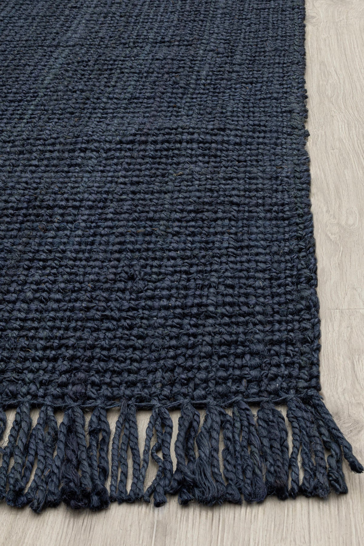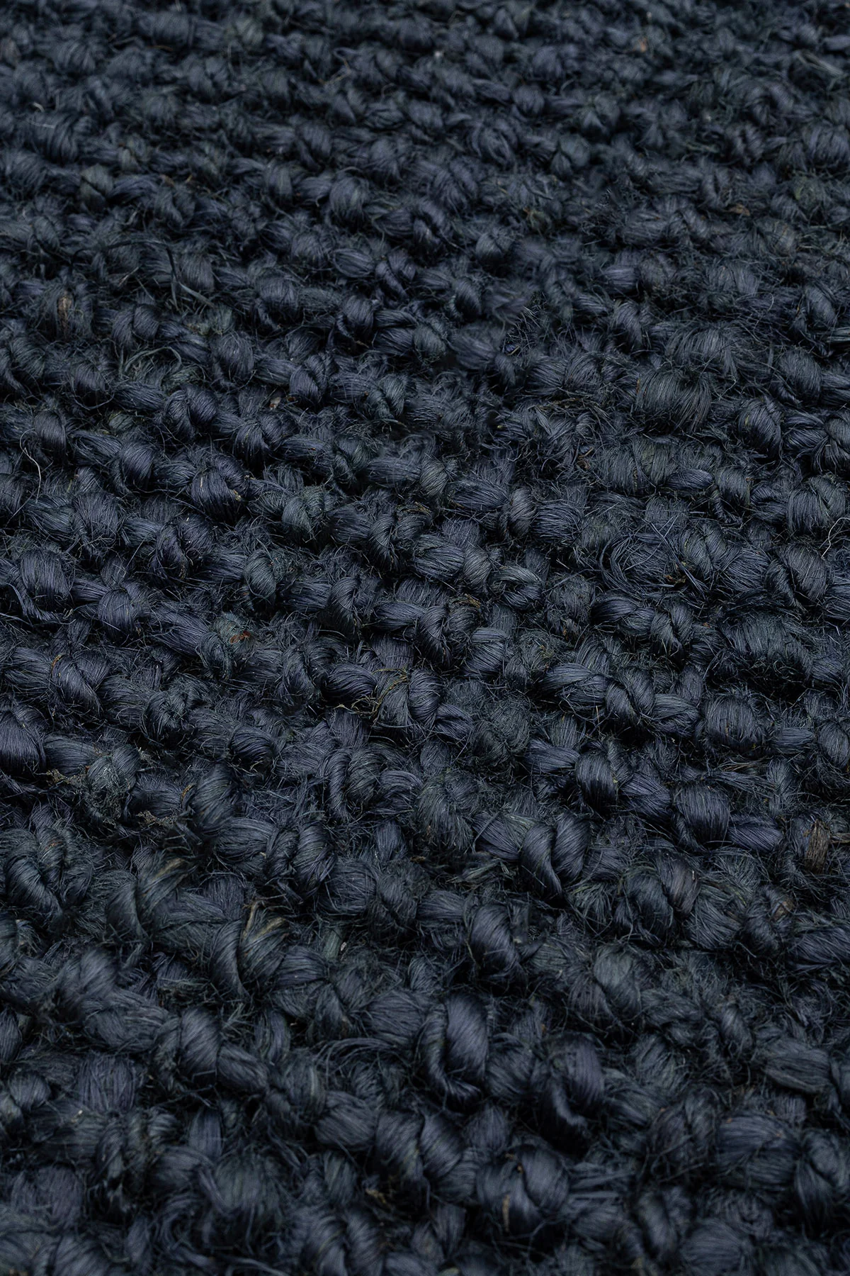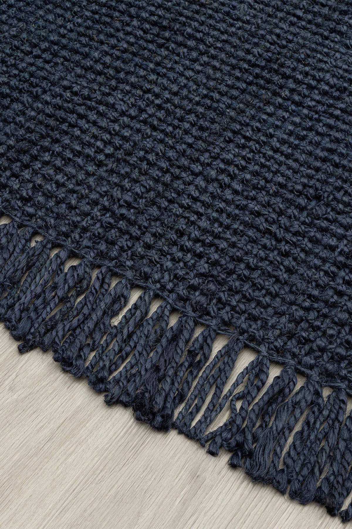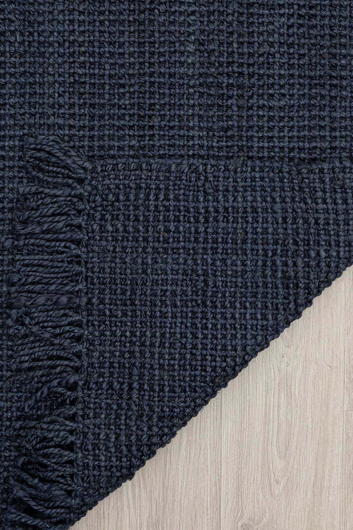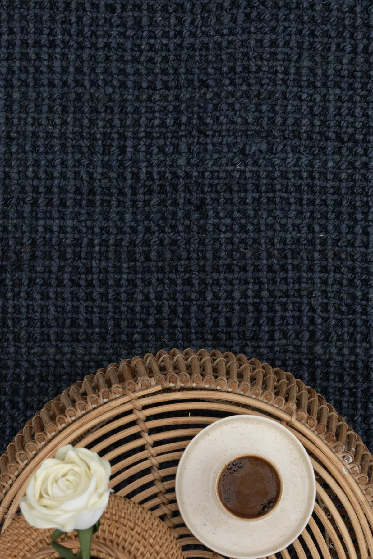 Темно синиот јутан тепих, ткаен рачно на разбој од природни јутани влакна во Индија, комбинира бохемски и автентичен стил. Со својата издржлива, еколошка и рециклирачка структура, обезбедува долготрајна употреба. Со природната текстура и живописната боја, создава елегантна атмосфера како во внатрешните, така и во надворешните простори.
