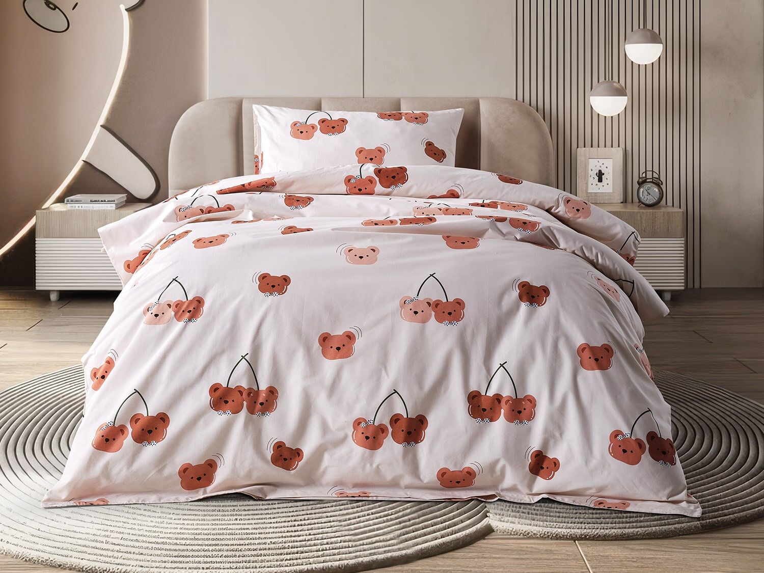 Ranforce Joyful Bearberry комплетот за постелнина, изработен од природен памучен конец, нуди удобно искуство на спиење со својата мека текстура и способност за дишење. Со модерните дезени и пастелните тонови, му дава свежина и елегантен изглед на вашата спална соба. Благодарение на издржливата ткаенина, обезбедува долготрајна употреба и лесно се чисти.