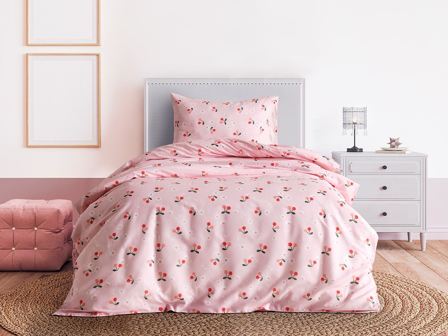 Ranforce Joyful Cherry постелниот комплет, изработен од природен памучен конец, нуди удобно искуство за спиење со својата мека текстура и дишечки материјал. Со живописни дезени на цреши и елегантни нијанси на бои, ќе внесе енергија и свежина во вашата спална соба. Благодарение на издржливата ranforce ткаенина, обезбедува долготрајна употреба и ја задржува мекоста како првиот ден при секое перење.