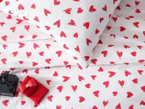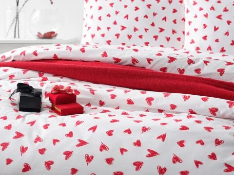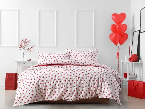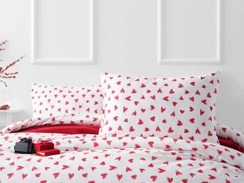 Ranforce Sweet постелниот комплет, со дизајн со срцеви шари, нуди елегантен и префинет изглед и го комбинира комфорот со дишечката памучна текстура. Благодарение на кралската големина, идеален е за широки кревети.