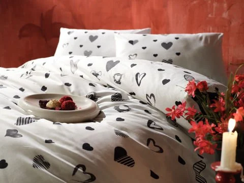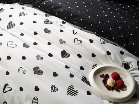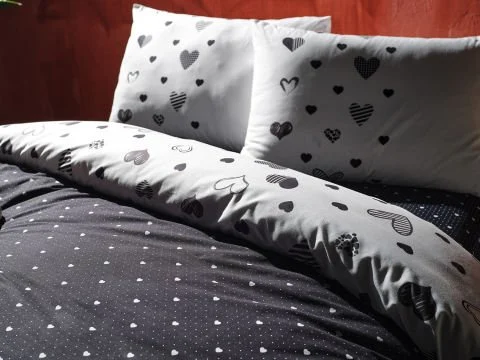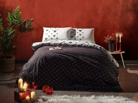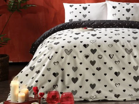100% памук со текстура на ранфорс, во жива црна боја, со шема на срца, комплет за постелнина за двоен кревет.