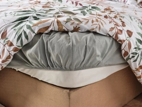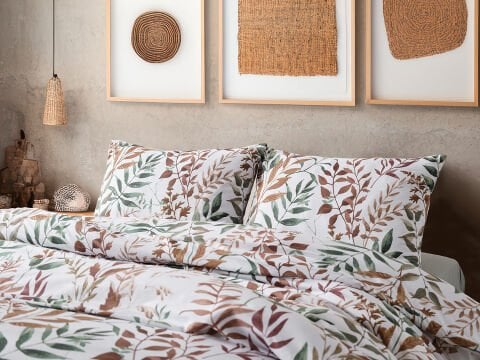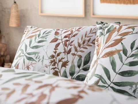 Комплет постелнина за двојен кревет во бела боја со дезен на лисја. Нуди елегантна декорација за спалната соба со својата мека и удобна текстура.