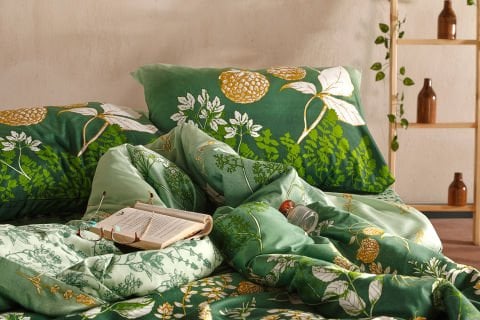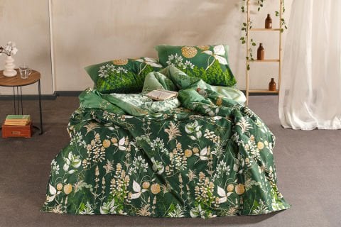 Со 100% памучна сатенска ткаенина и густина од 53 нишки, овој двоен постелни комплет нуди меко, сјајно и удобно користење, а со својата жива зелена боја му дава елегантен изглед на секоја спална соба.