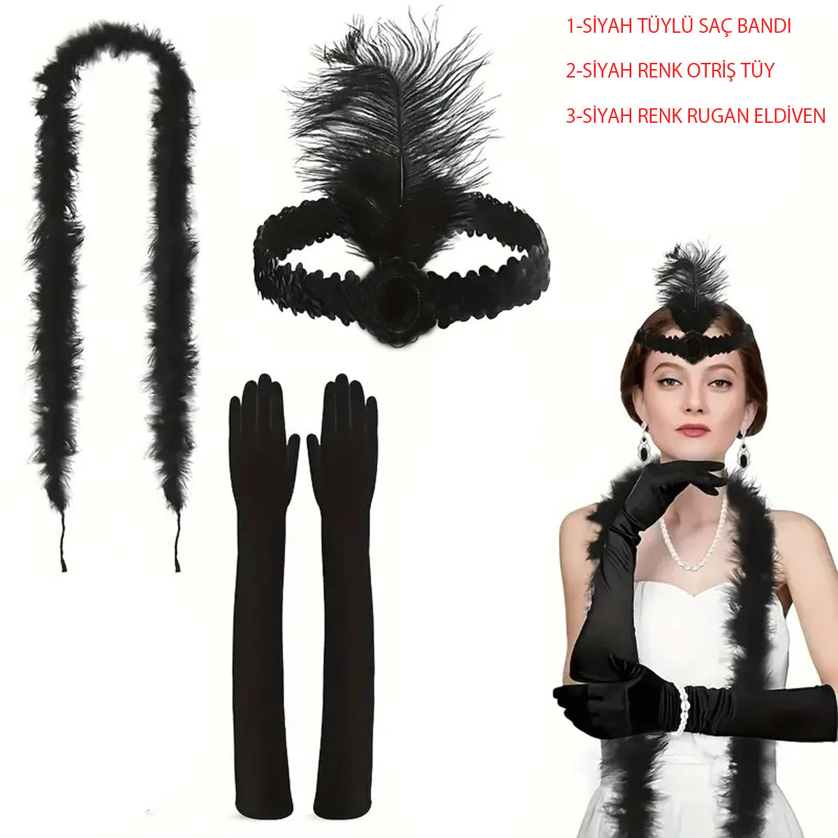 Сет со црна перика, ругацки црни ракавици и црн ориш создава забележителен стил со својот носталгичен и елегантен изглед. Периката со перја е флексибилна и удобно се носи, а ругацките ракавици додаваат елеганција со својот сјаен изглед.