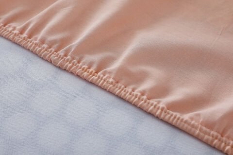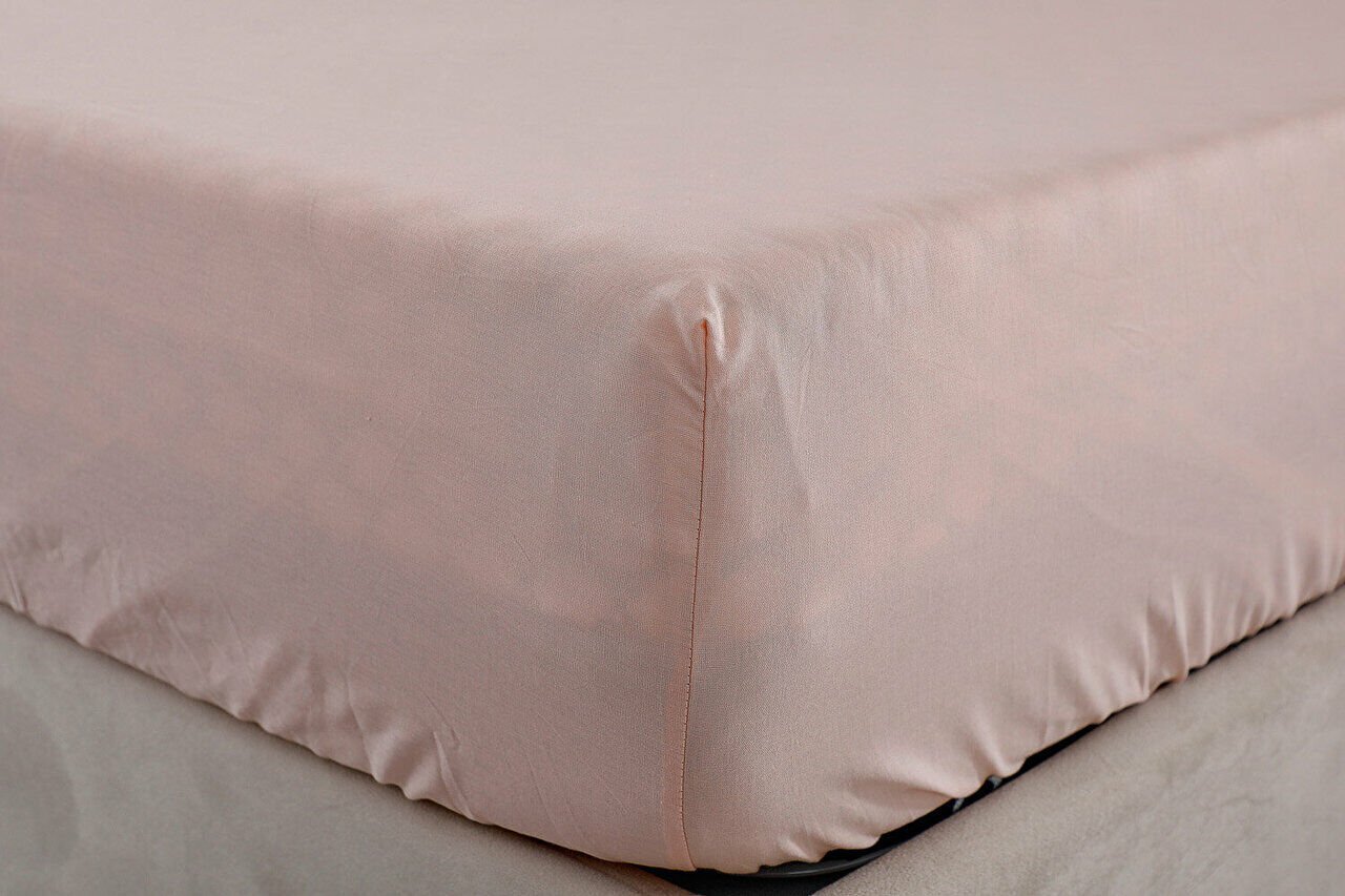Чаршафот во боја на лосос, изработен од 100% памучна ткаенина, со целосно еластични рабови совршено се прилагодува на креветот. Нуди удобно искуство за спиење со лесна употреба и мека текстура.