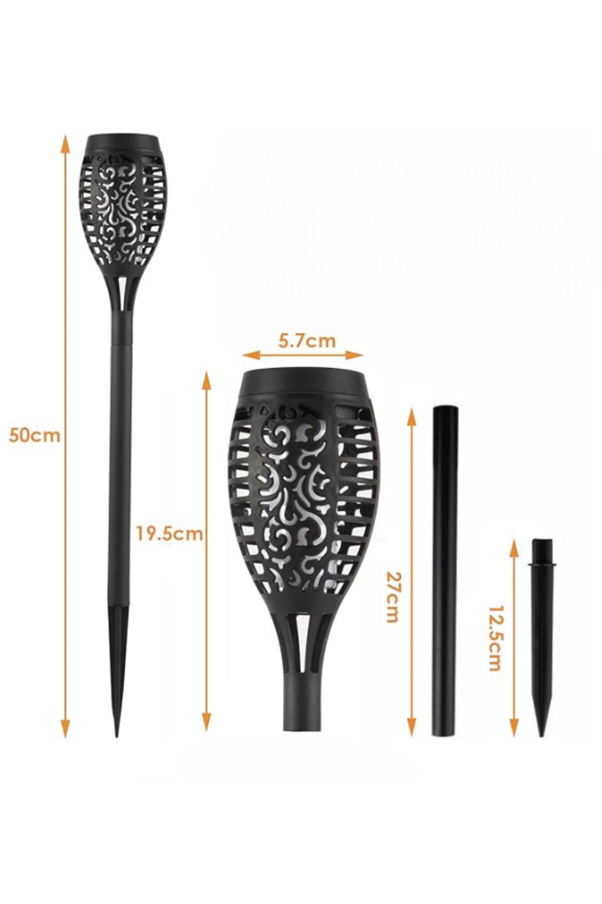 Соларна ламба со ефект на пламено е идеална за употреба во градини или отворени простори благодарение на колците кои можат да се забијат во земјата. Исто така, може да се користи и на маси или на различни површини. Оваа ламба работи на сончева енергија, нудејќи еколошка опција и создавајќи убава атмосфера со ефект на пламен. Со својот практичен дизајн и мултифункционална употреба, таа привлекува внимание.