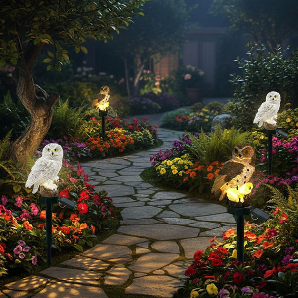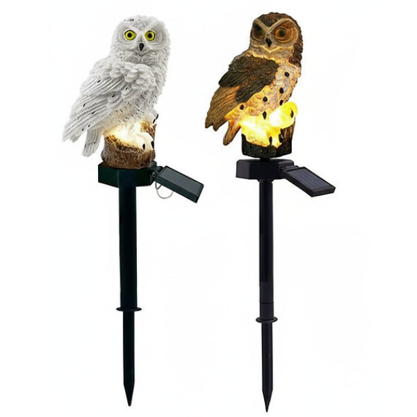 Соларно осветлување за градина со дизајн на сова е елегантен производ кој не само што ја осветлува вашата градина, туку и додава декоративен изглед. Работи на сончева енергија, така што можете да го користите без грижа за сметките за електрична енергија.