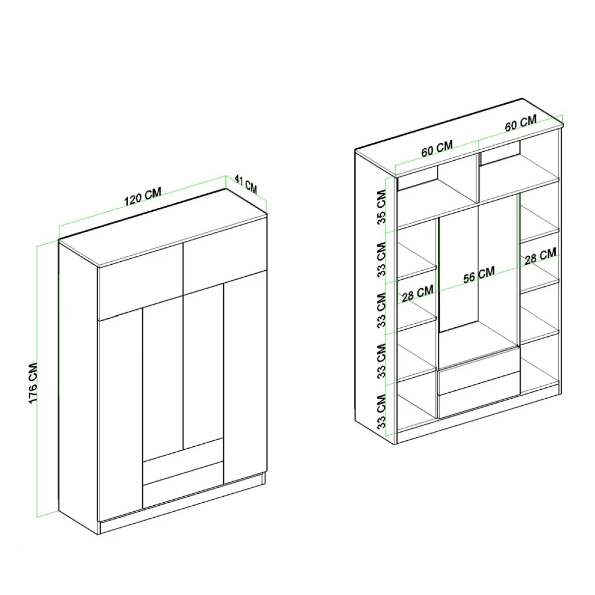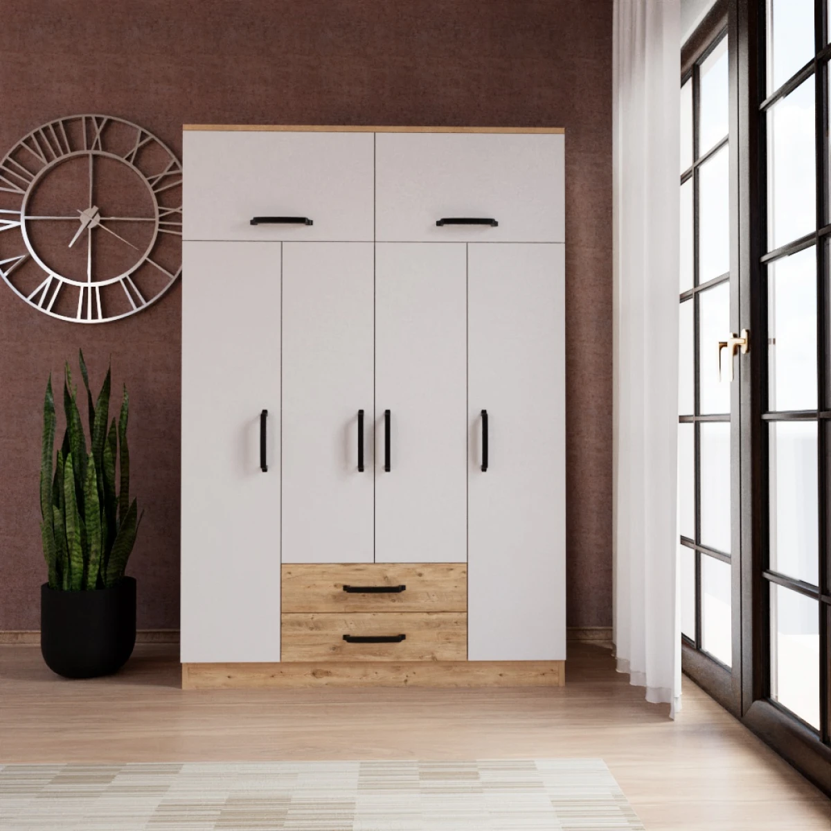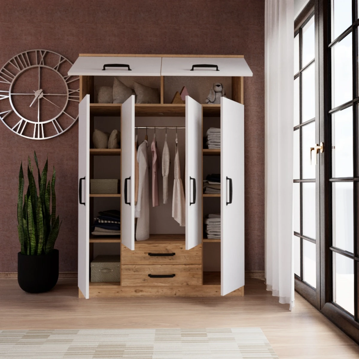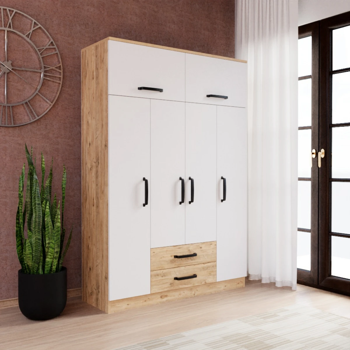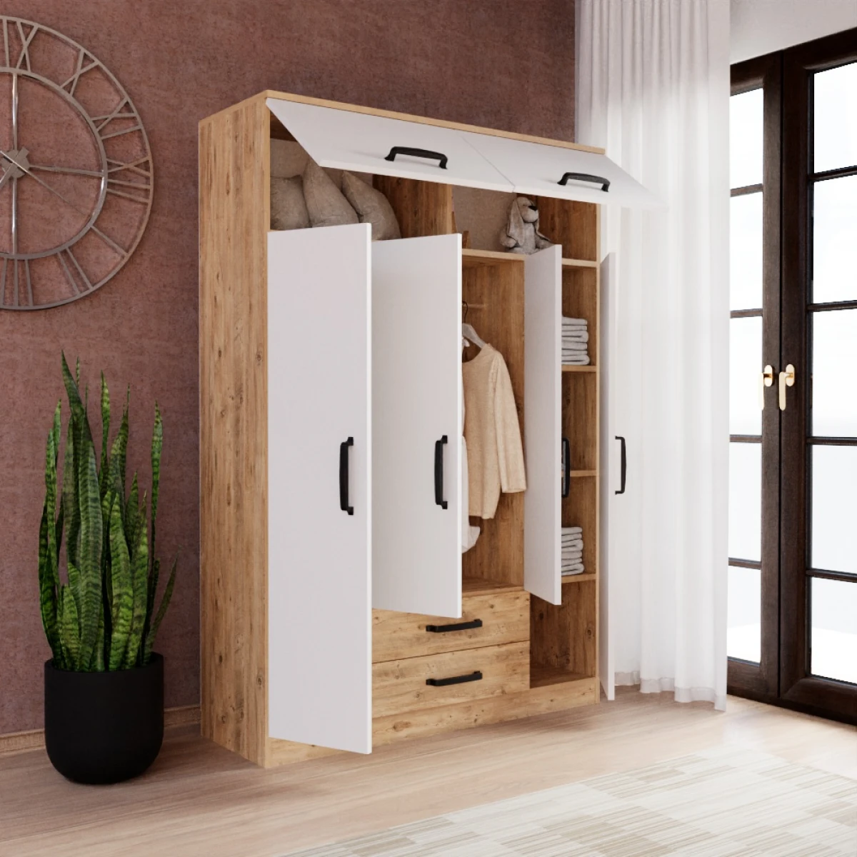 Тема Гардеробот, со комбинација на бели и бор бои, на вашите спални соби им дава модерен и свеж изглед. Со дизајн од 6 врати и 2 фиоки, нуди голем простор за складирање, помагајќи ви да ги чувате вашите предмети на организиран начин. Со издржлива материјална структура, обезбедува долготрајна употреба.