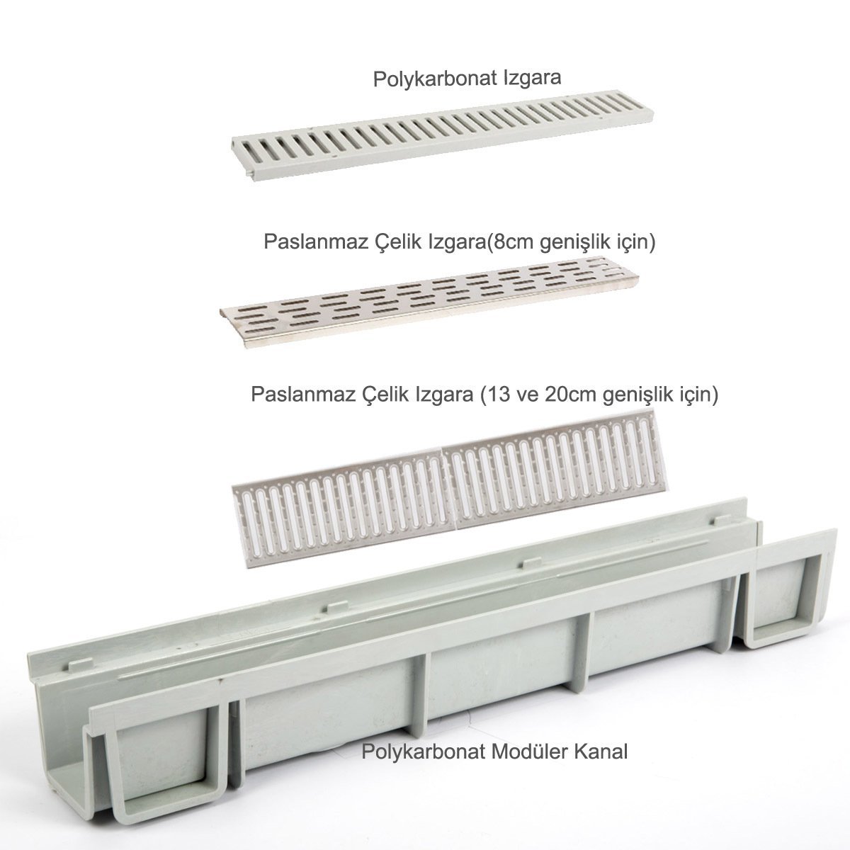 Модуларниот поликарбонатен канал и горната решетка се прилагодливи за различни потреби со различни опции за широчина. Овие канали и решетки изработени од поликарбонат и нерѓосувачки челик се издржливи и долготрајни. Излезната точка на каналот може да биде Ø50 или Ø70, со можност за излез од долу за флексибилност. Секој модул е со должина од 50 цм и може да се прилагоди за различни широчини според просторот за употреба. Овие производи дизајнирани за идеално одводување на вода може да се користат во бањи, тоалети и индустриски простории.