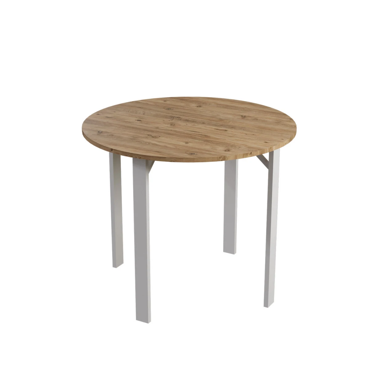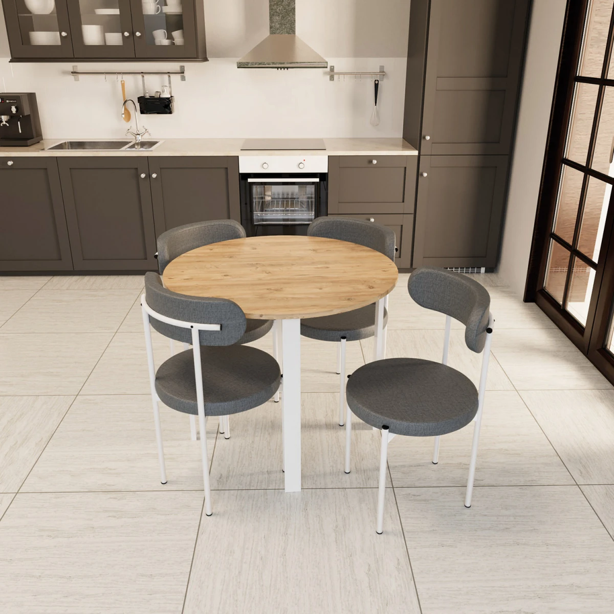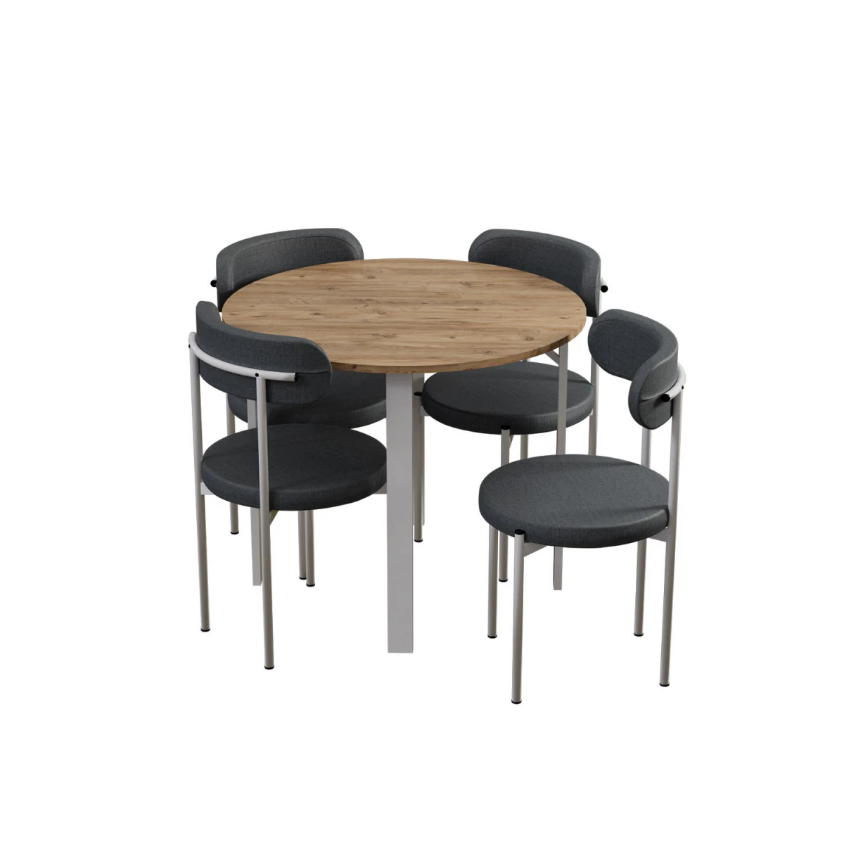 Тренд Тркалезна Маса за 4 Лица; со усогласеност на боите бор, сива и бела, тркалезен дизајн на масата и цврста структура, му дава модерен изглед на вашите кујни и трпезарии. Благодарение на издржливата метална конструкција на ногарките и ергономските столици, нуди удобно и долготрајно користење.