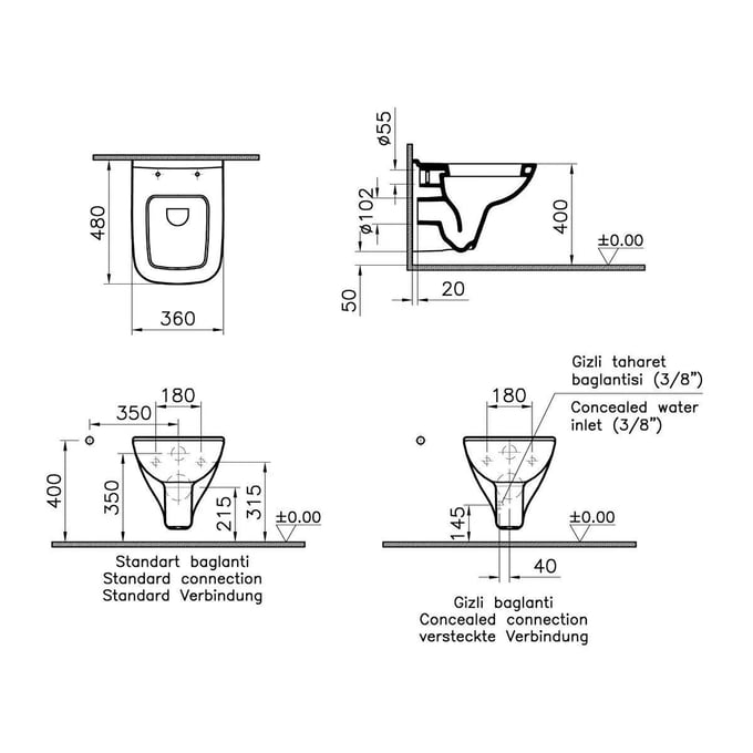 VitrA S20 Квадратен Бел Краток Висечки Водокотли и Вграден Резервоар Комплетен Сет 800-2027, со својот модерен дизајн и хигиенични карактеристики додава елеганција на вашата бања. Оваа колекција, изработена со потпис на дизајнерот Noa, има димензии од 350 мм висина, 360 мм ширина и 480 мм длабочина. Со својот бел цвет и канален дизајн обезбедува максимална хигиена. Влезот на душ-бидеот е со цевка, а капакот на водокотлиот е вклучен во цената.