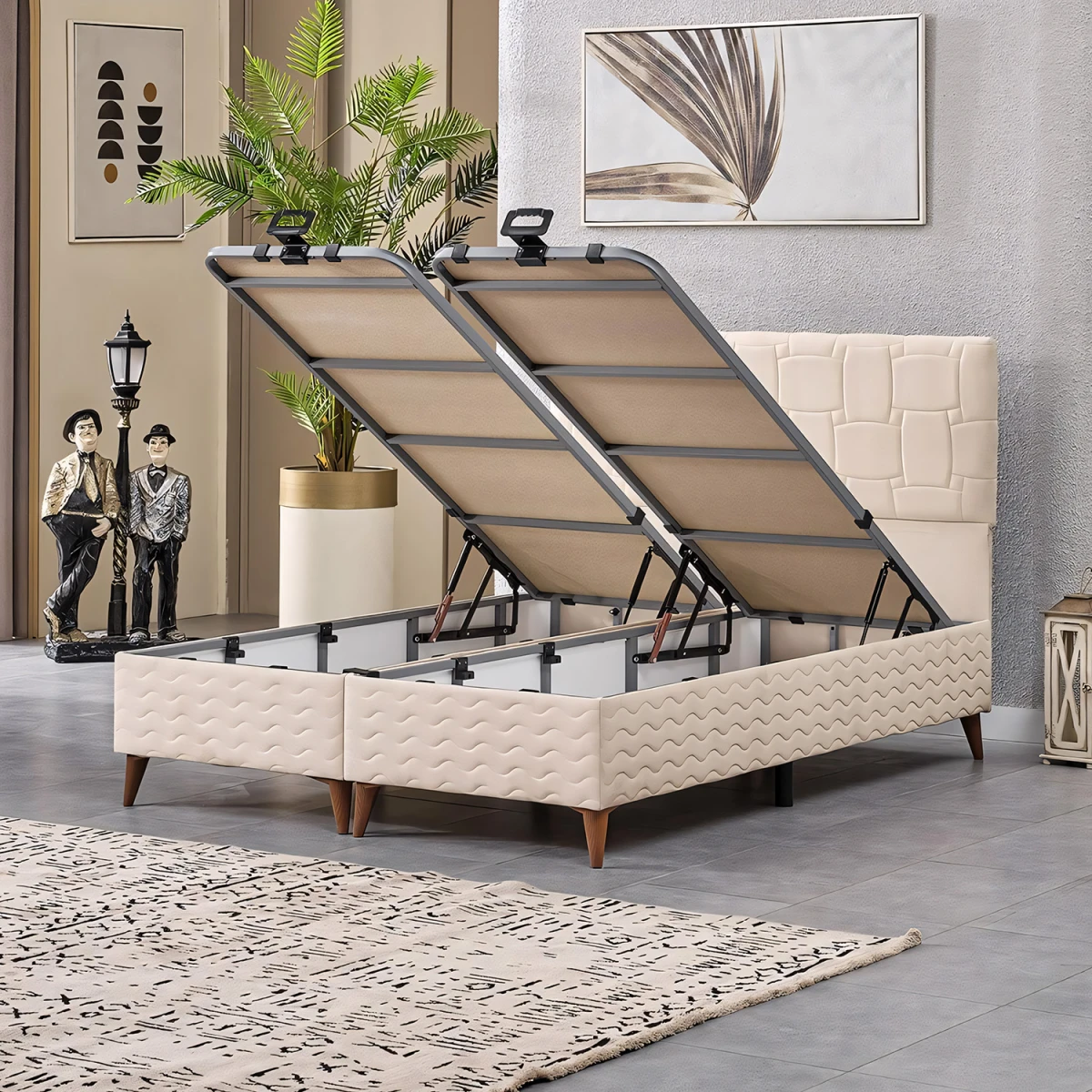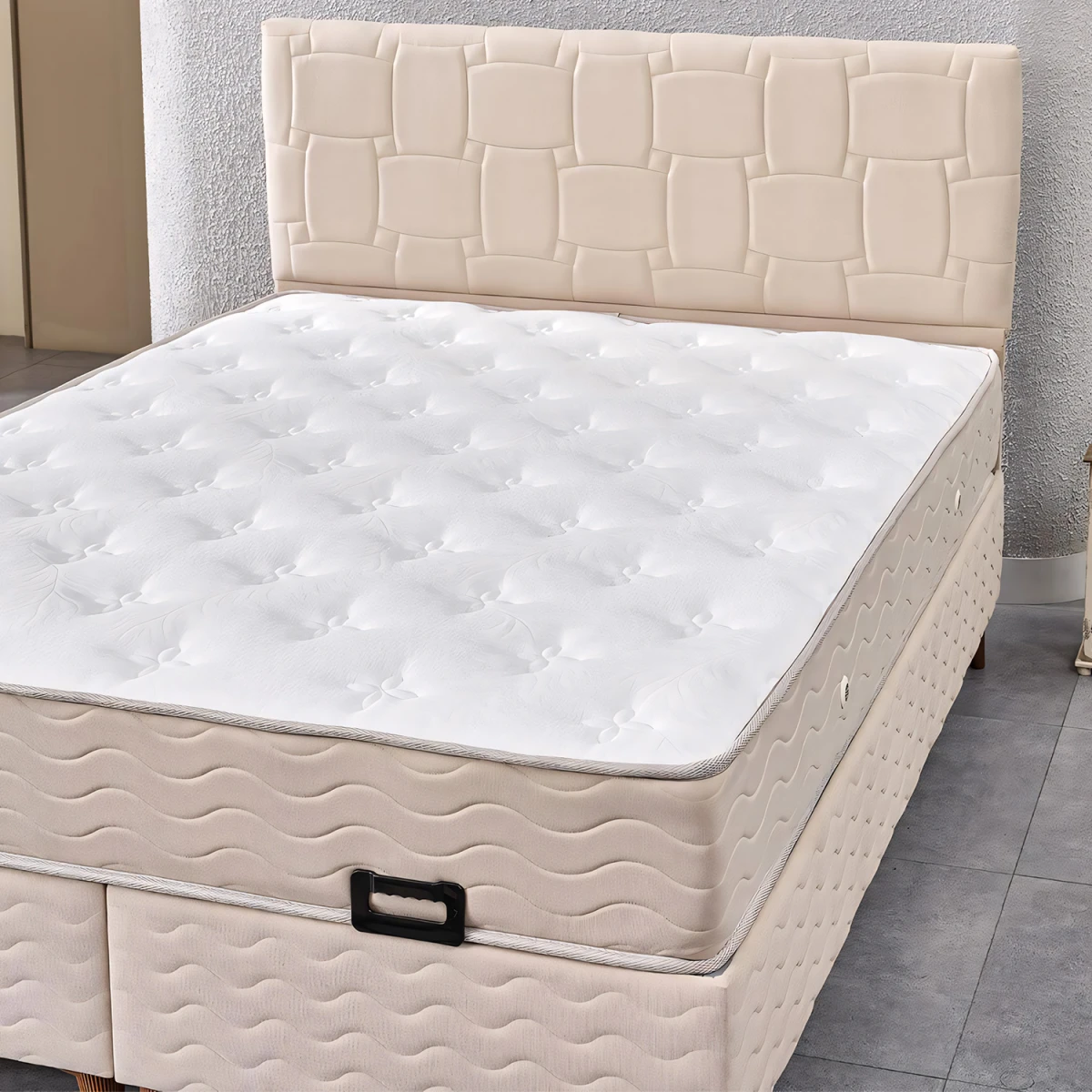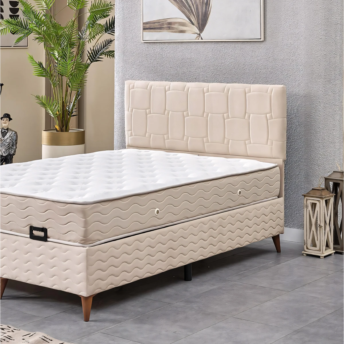 Визион Сет за Двојно Легло, со својот елегантен крем боја и квалитетен материјал, додава удобност и естетика во вашите спални соби. Со издржлива подлога, ергономски наслон и удобен дизајн на душек, нуди долготрајно и пријатно искуство на спиење.