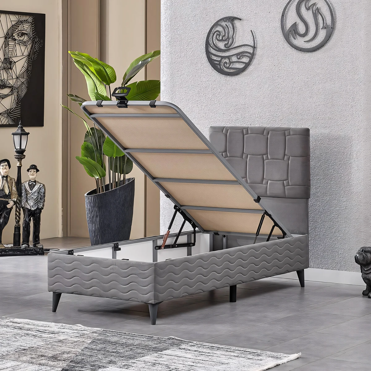 Визион Единечен легло и Наслон Сет, со својот модерен сив изглед и цврста конструкција, нуди идеално решение за спиење за младински соби и гостински соби. Благодарение на издржливата метална рамка на леглото и удобниот наслон, обезбедува долготрајна и комфорна употреба.