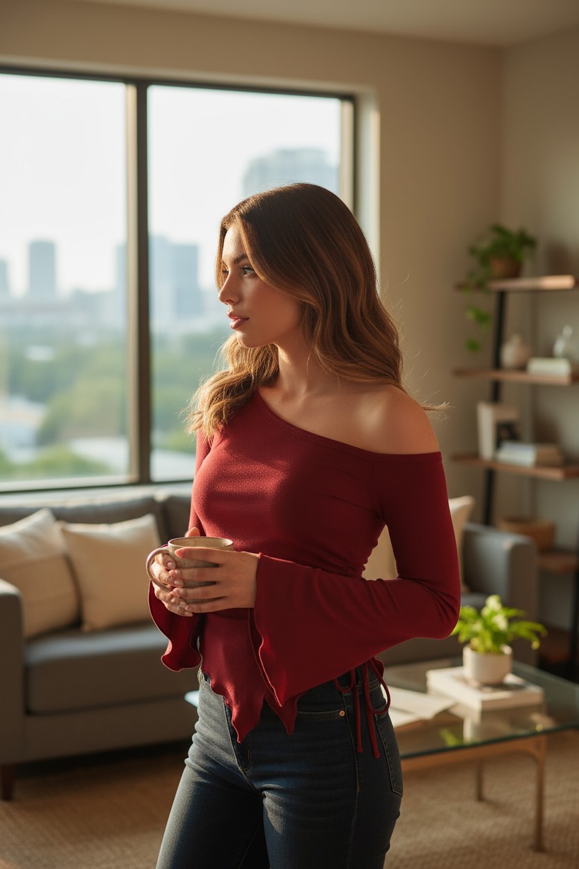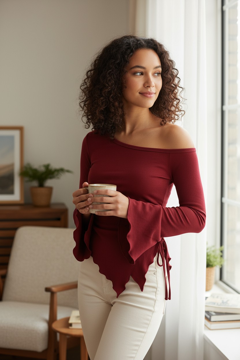 Женска Бордо Блуза со Долги Испански Ракави и Асиметричен Врат