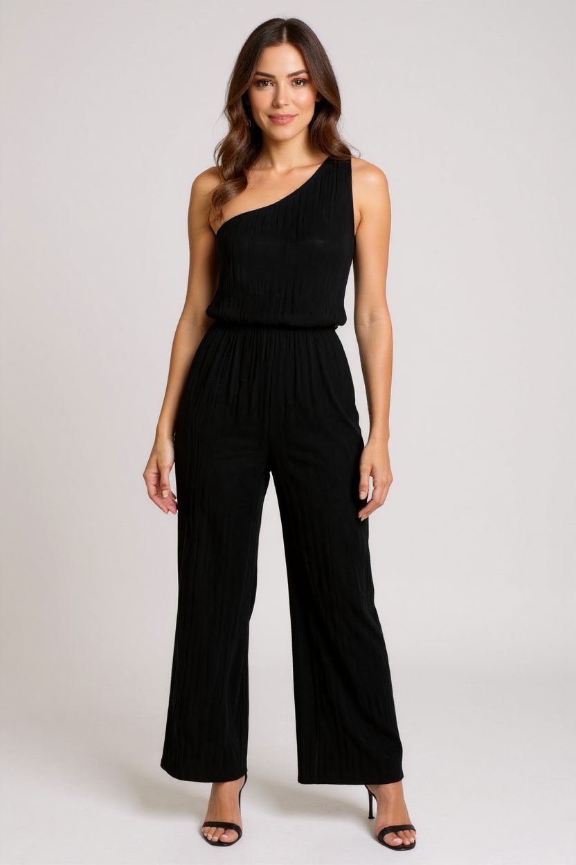 Женска Црна Еднорамна Стилска Блуза & Широки Панталони Комплет – Модерен, Удобен и Соодветен за Секојдневни Комбинации