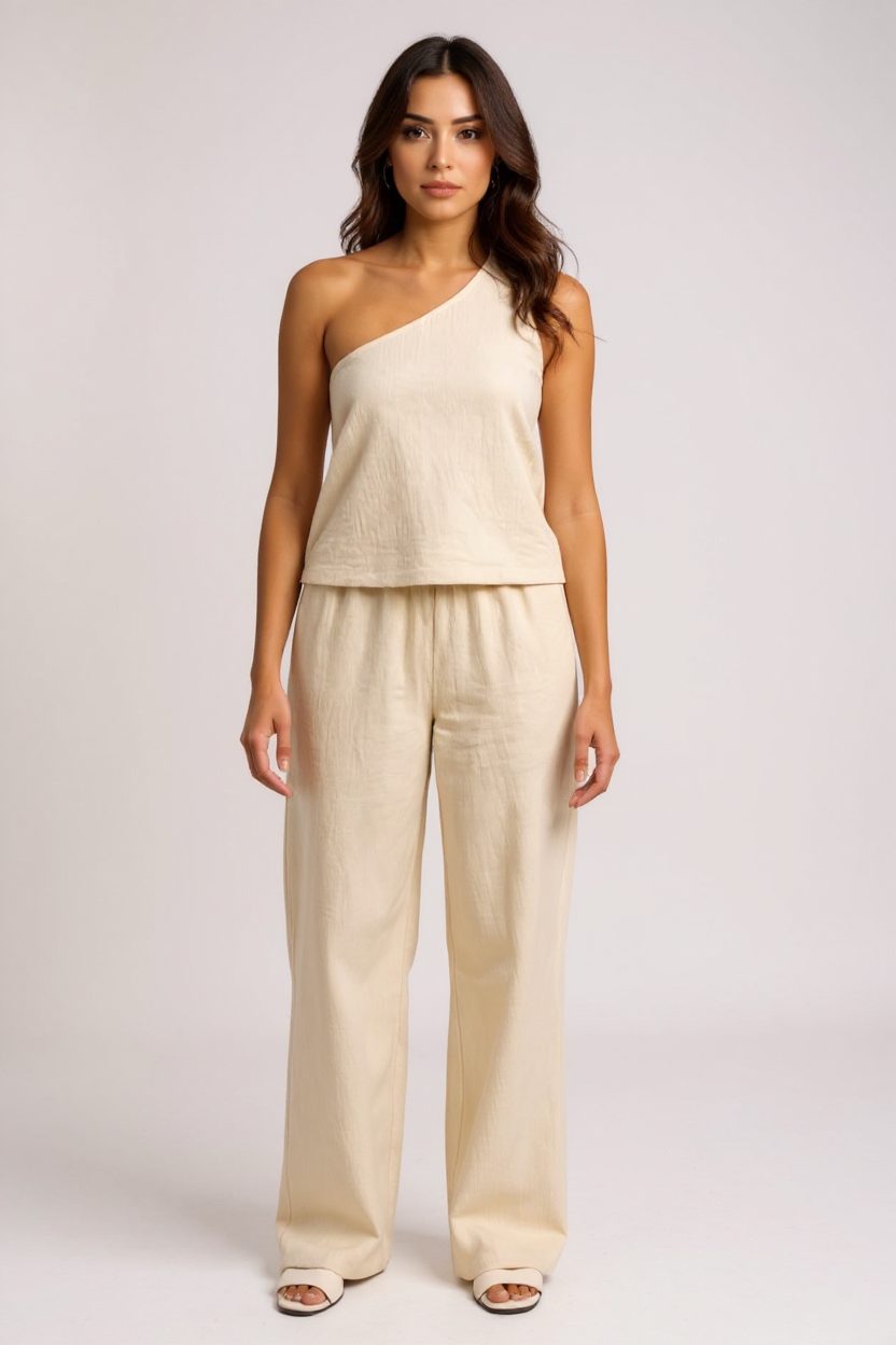 Со својот единствен дизајн со едно рамо, овој сет нуди женствен изглед, додека широките панталони со висок струк додаваат удобност и стил. Лесната ткаенина е идеална за лето, а може да се комбинира и со јакна за променливи времиња.