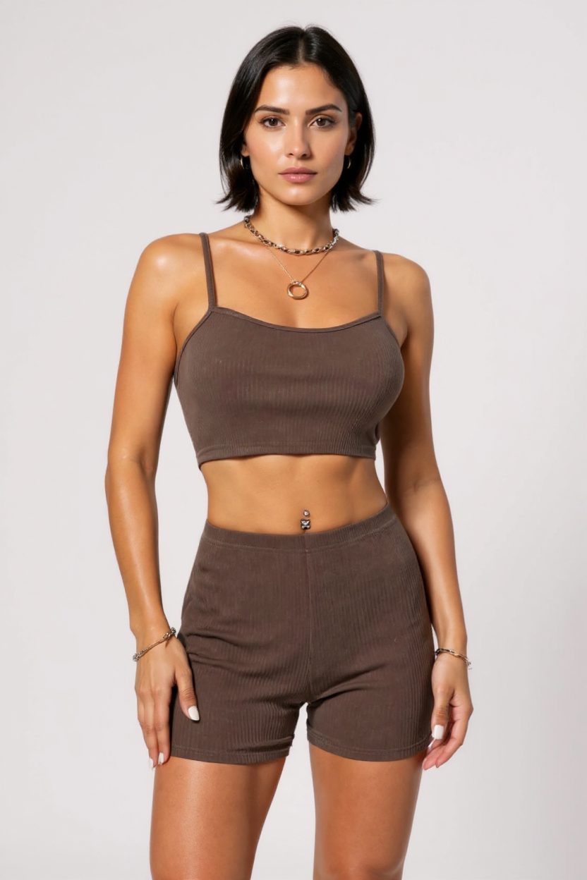 Женски кафеав шорц со какашорс гечлек сет е совршен за секојдневни комбинации. Овој модерен и удобен сет е направен од 100% домашна продукција, што го прави идеален за секоја жена.