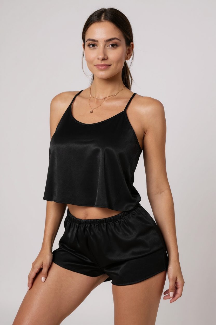 Женски црн асиметричен шорц со длабок деколте е идеален избор за секојдневни комбинации. Овој модерен и удобен сет е совршен за домашна носење или за излегување. Со својот уникатен дизајн, ќе се чувствувате самоуверено и стилски.