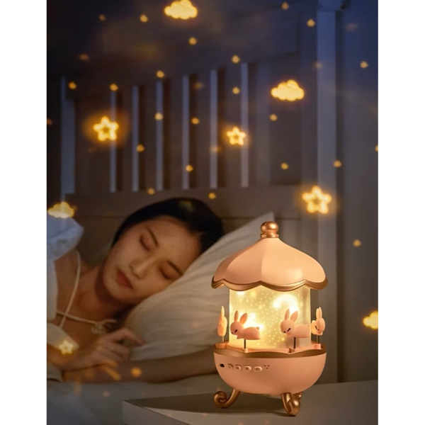 Зечка Вртелешка Мултифункционален Проектор е иновативен производ кој може да функционира и како музичка кутија, овозможувајќи ви да слушате музика преку Bluetooth од мобилни уреди. Неговите фигури на зечето на врвот и внатре се ротираат, правејќи ја ноќта поразиграна.